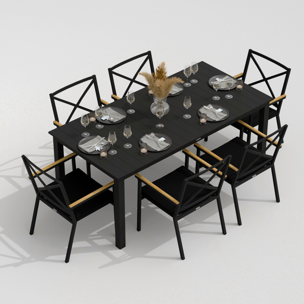 Каркас мебели выполнен из всесезонного алюминия с порошковым покрытием темно-серого цвета, подлокотники стульев декорированы вставками из тика, подушки сидений обшиты уличной тканью черного цвета с водоотталкивающей пропиткой, толщина подушек 5 см, съемные чехлы на "молнии", столешница обеденного стола изготовлена из алюминиевых планок с порошковым покрытием темно-серого цвета