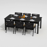 Каркас мебели выполнен из всесезонного алюминия с порошковым покрытием темно-серого цвета, подлокотники стульев декорированы вставками из тика, подушки сидений и спинок обшиты уличной тканью темно-серого цвета с водоотталкивающей пропиткой, толщина подушек 5 см, съемные чехлы на "молнии", столешница обеденного стола изготовлена из алюминиевых планок с порошковым покрытием темно-серого цвета