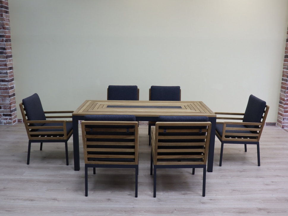 Каркас мебели выполнен из всесезонного алюминия с порошковым покрытием темно-серого цвета, подлокотники и спинки стульев изготовлены из натурального тика, подушки сидений и спинок обшиты премиальной уличной тканью темно-серого цвета с водоотталкивающей пропиткой, толщина подушек 5 см, съемные чехлы на "молнии", столешница обеденного стола изготовлена из натурального тика с керамической вставкой для горячего по центру.