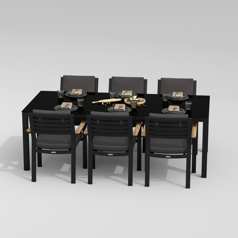Каркас мебели выполнен из всесезонного алюминия с порошковым покрытием темно-серого цвета, подлокотники стульев декорированы вставками из тика, подушки сидений обшиты уличной тканью темно-серого цвета с водоотталкивающей пропиткой, толщина подушек 5 см, чехол съемный на "молнии", столешница обеденного стола изготовлена из закаленного стекла толщиной 5 мм, с нанесением черного цвета с помощью шелкотрафаретной печати.