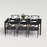 Каркас мебели выполнен из всесезонного алюминия с порошковым покрытием темно - серого цвета (карбон), подлокотники стульев декорированы вставками из тика, подушки сидений обшиты уличной тканью темно - серого цвета с водооталкивающей пропиткой, толщина подушек 5 см, чехол съемный на "молнии", столешница обеденного стола глянцевая, изготовлена из закаленного стекла толщиной 5 мм, с нанесением черного цвета с помощью шелкотрафаретной печати.