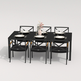 Каркас мебели выполнен из всесезонного алюминия с порошковым покрытием темно-серого цвета (карбон), подлокотники стульев декорированы вставками из тика, подушки сидений обшиты уличной тканью черного цвета с водоотталкивающей пропиткой, толщина подушек 5 см, чехол съемный на "молнии", столешница обеденного стола глянцевая, изготовлена из закаленного стекла толщиной 5 мм, с нанесением черного цвета с помощью шелкотрафаретной печати.