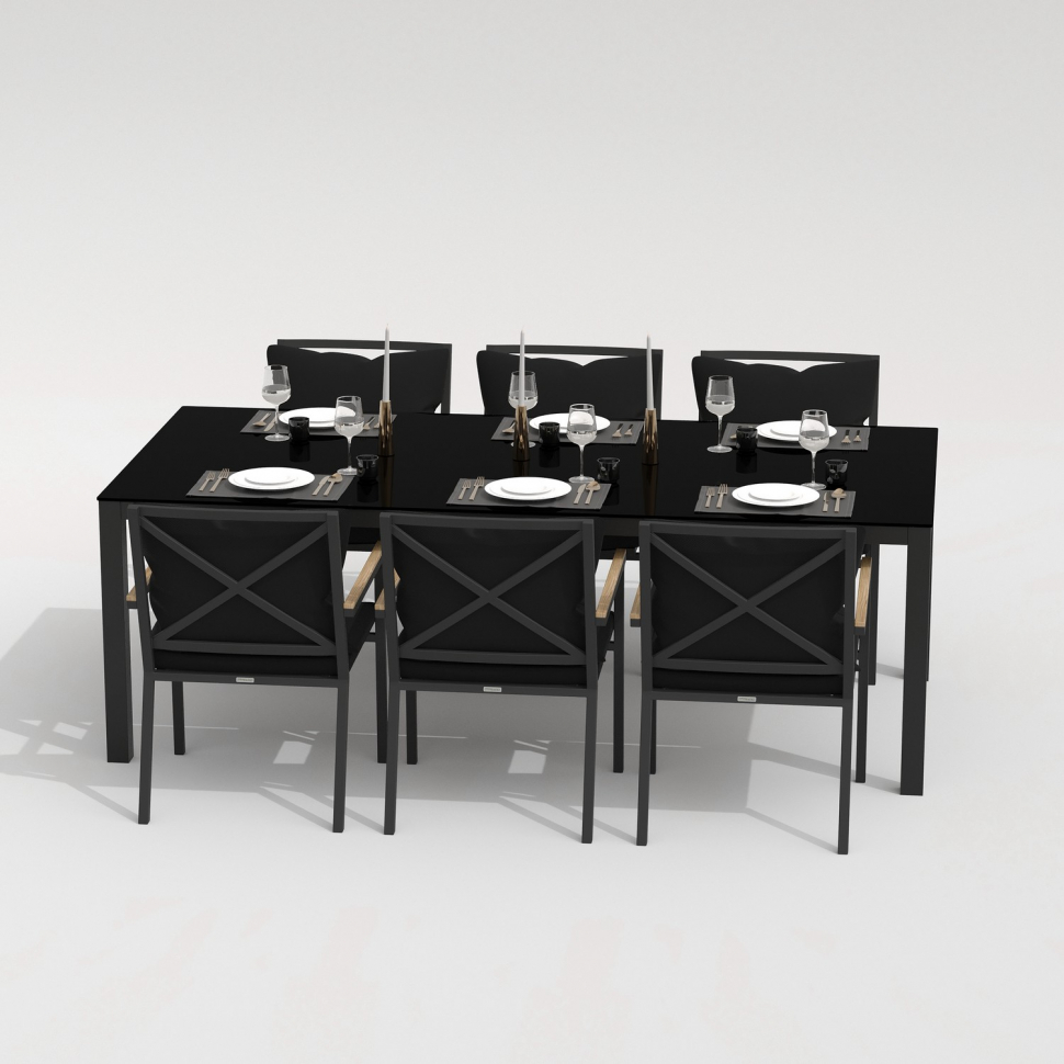 Каркас мебели выполнен из всесезонного алюминия с порошковым покрытием темно-серого цвета (карбон), подлокотники стульев декорированы вставками из тика, подушки сидений и спинок обшиты уличной тканью черного цвета с водоотталкивающей пропиткой, толщина подушек 5 см, съемные чехлы на "молнии", столешница обеденного стола глянцевая, изготовлена из закаленного стекла толщиной 5 мм, с нанесением черного цвета с помощью шелкотрафаретной печати