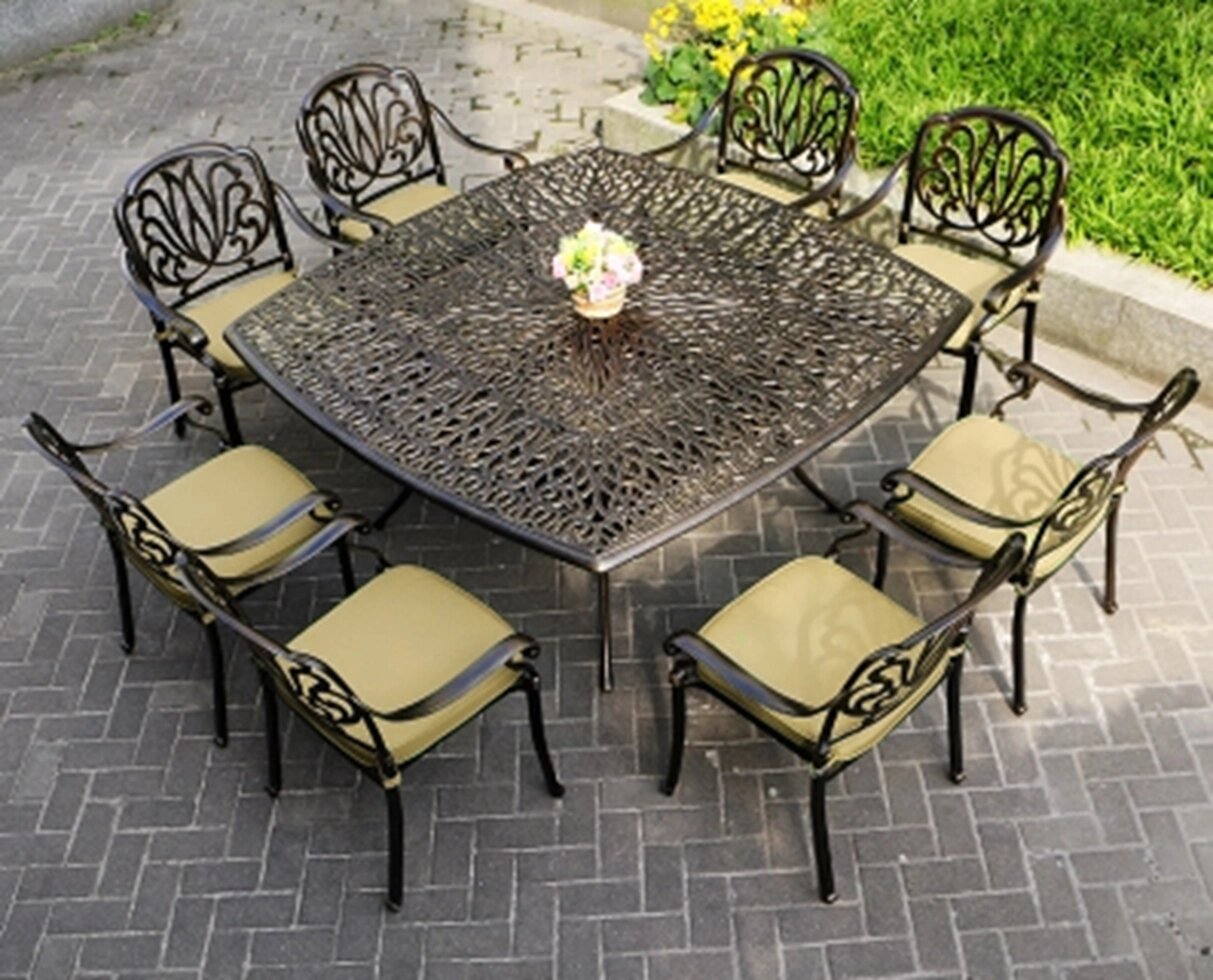 Квадратная обеденная группа из литого алюминия рассчитана на 8 персон и отлично выглядит на террасе или в беседке. Такой металлической мебели из алюминиевого сплава не страшны перепады температур и различные погодные осадки, она может использоваться как в саду, так и в доме. Набор состоит из квадратного стола и 8 кресел с бежевыми подушками (фото 2).