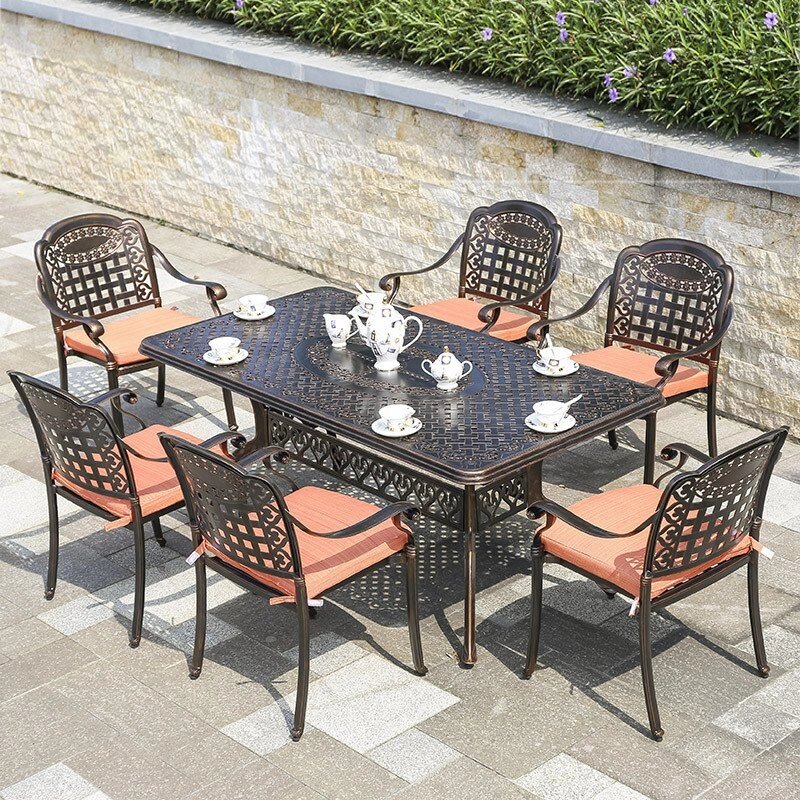 Небольшая, но вместительная обеденная группа мебели из литого алюминия на 6 персон будет очень выгодно смотреться на террасе или в беседке. Эта всепогодная литая мебель, которой не страшны перепады температур и различные погодные осадки, может использоваться и под открытым небом. Набор состоит из прямоугольного стола и 6 кресел с подушками.