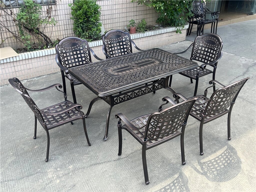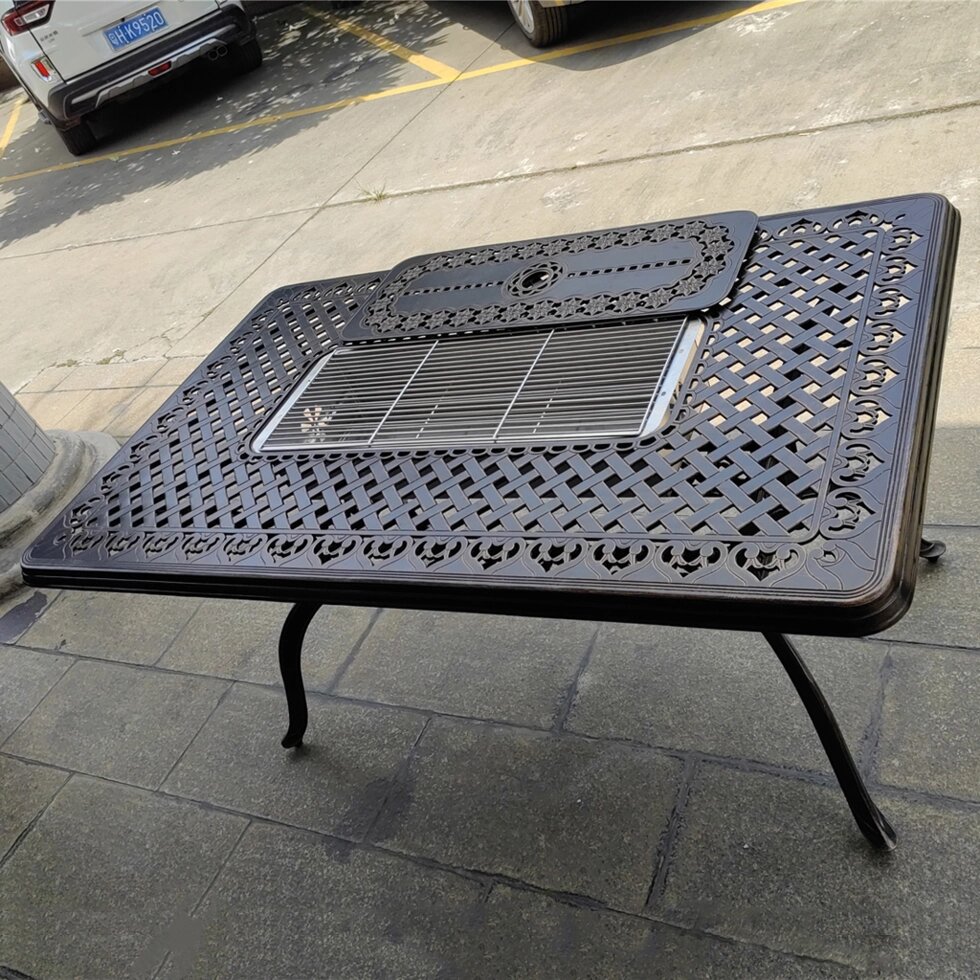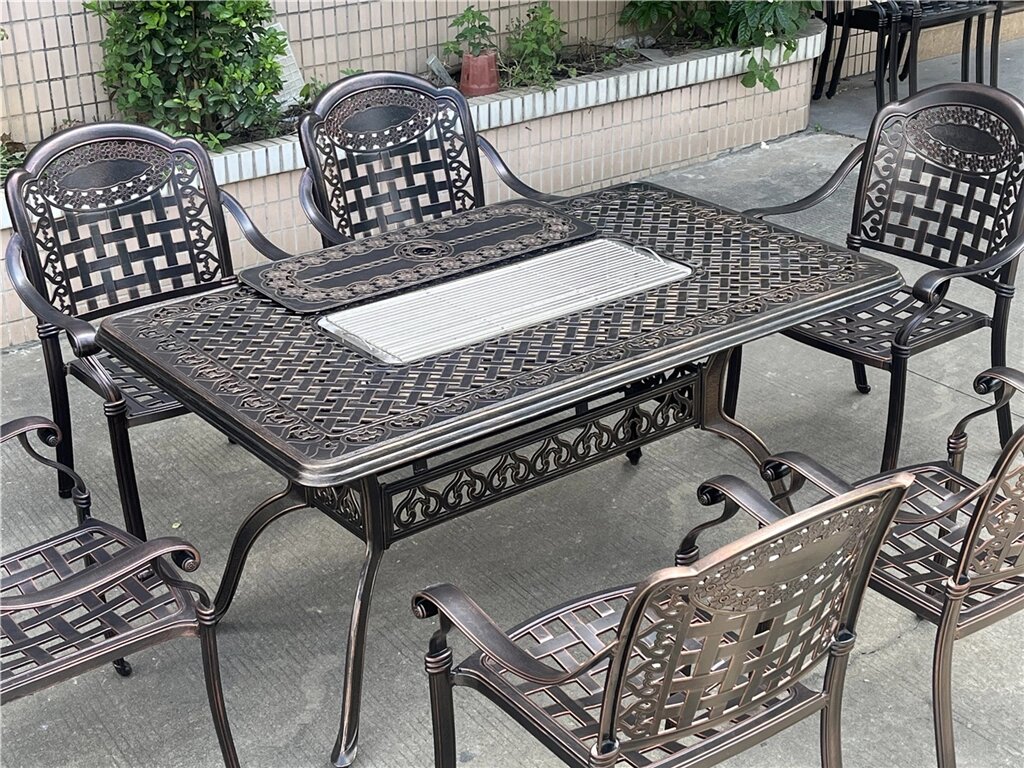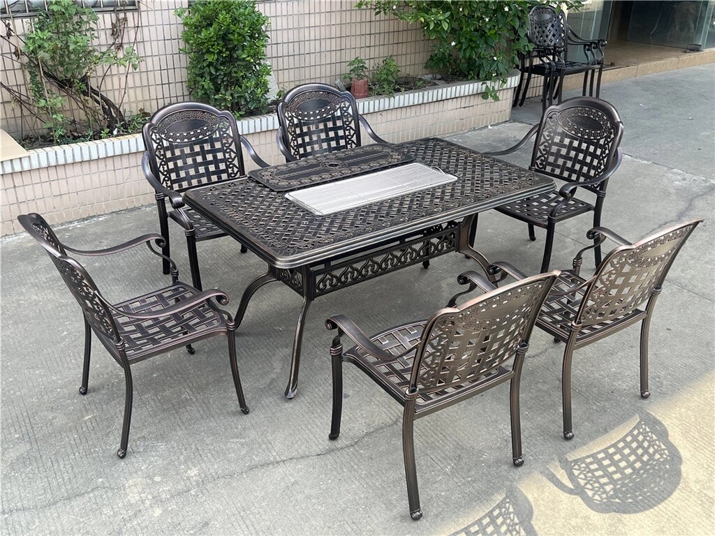 Металлическая обеденная группа из литого алюминия со столом-мангалом на 6 персон великолепно смотрится на террасе или в беседке. Такая литая садовая мебель из алюминия может использоваться в любую погоду, даже на улице. Набор состоит из металлического стола и 6 кресел, светоло-бежевые подушки в комплекте.