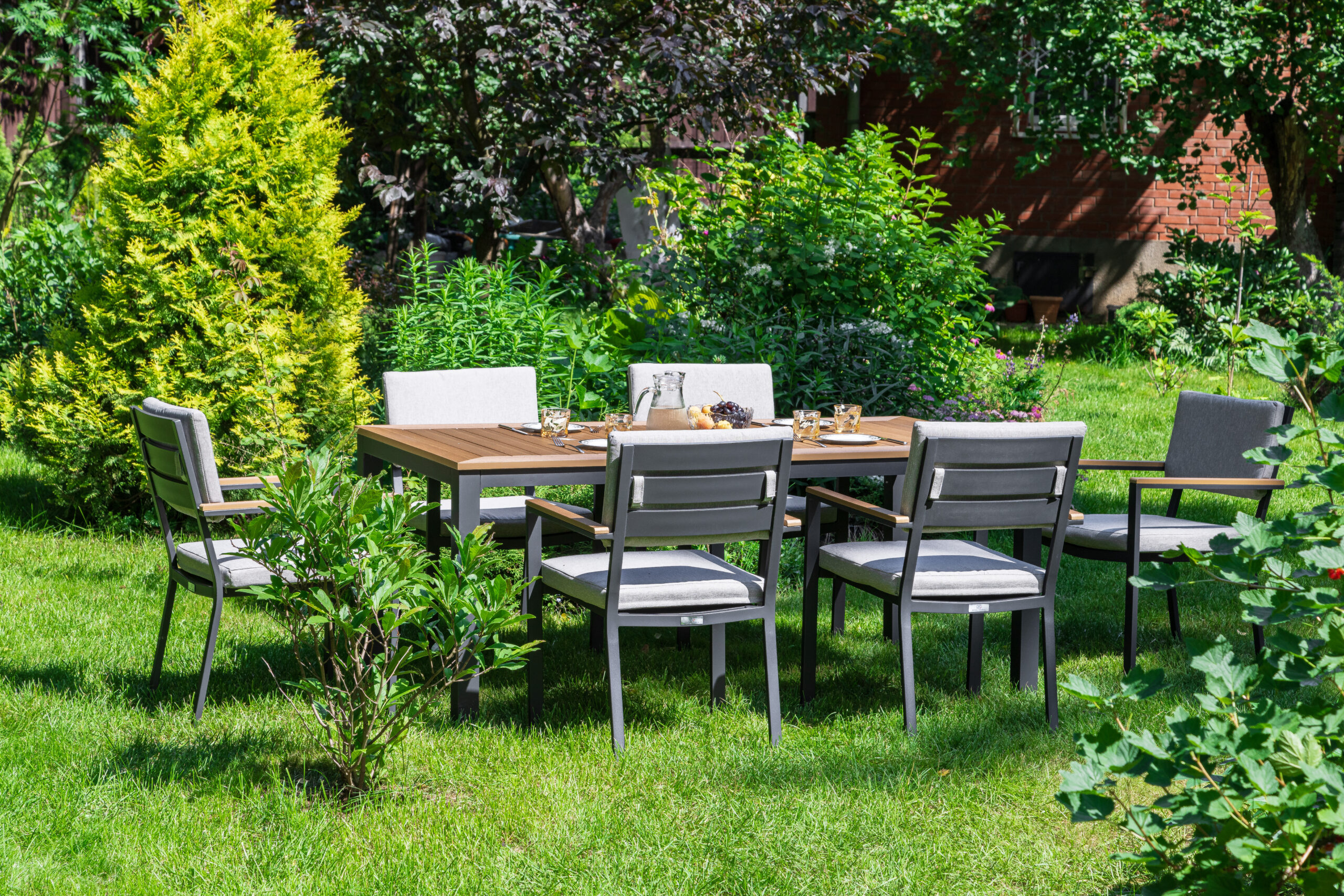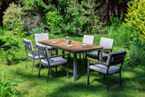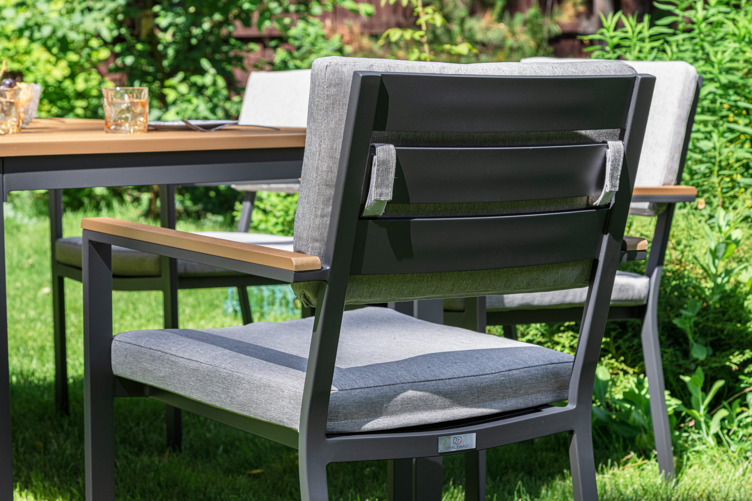 Комплектация и габариты: Кресла (6 шт) - 57х62х85 см Высота от Пола до сиденья кресло: 40/43см Ширина сиденья - 48 см Глубина сиденья - 51 см Высота подлокотников - 21 см Толщина столешницы - 2см Обеденный стол - 180х90х75 см Подушки для сиденья (6 шт) - 50х50х6 см Подушки для спины (6 шт) - 50х30х6 см Материалы: Материал каркаса – алюминий, окрашенный порошковым методом Материал столешницы и подлокотников – поливуд Материал чехла на подушки - олефин (водоотталкивающая ткань) Материал наполнителя подушек для сидения - поролон Цвет подушек – Светло-серый Дополнительная информация: Количество посадочных мест – 6 человек Максимальная нагрузка на посадочное место - 150 кг Чехлы съемные – да Температурный режим - от -50?C до +50?C Сочетается с комплектами бренда ROYAL FAMILY Накладки на ножки - да (пластиковые) Держатели и крепления подушек зависят от поставки и не являются неотъемлемой частью комплекта Гарантийный срок - 1 год Эксплуатационный срок - 10 лет Страна производитель - КитайХарактеристики