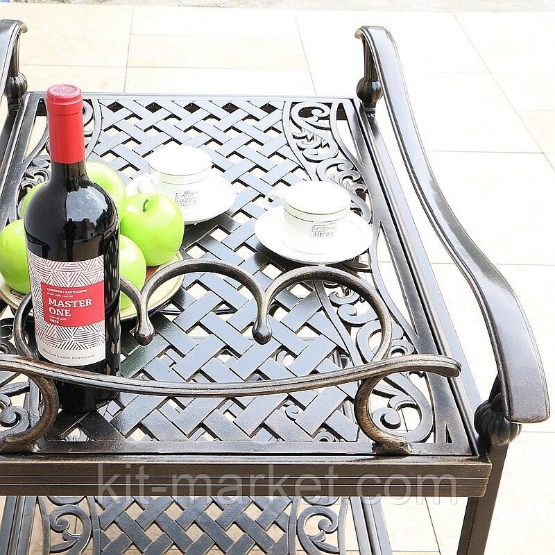 Сервировочный столик Latin из литого алюминия станет красивым дополнением к обеденной группе или комплекта для отдыха из металла, на нем можно расположить напитки, посуду, фрукты и все, что не помещается на основной стол. Наличие колесиков обеспечивает легкость управления даже в нагруженном состоянии. Данная садовая литая мебель является практичным решением для террасы или беседки, не ржавеет и спокойно переносит любые перепады температур окружающей среды. Цвет: античная бронза.