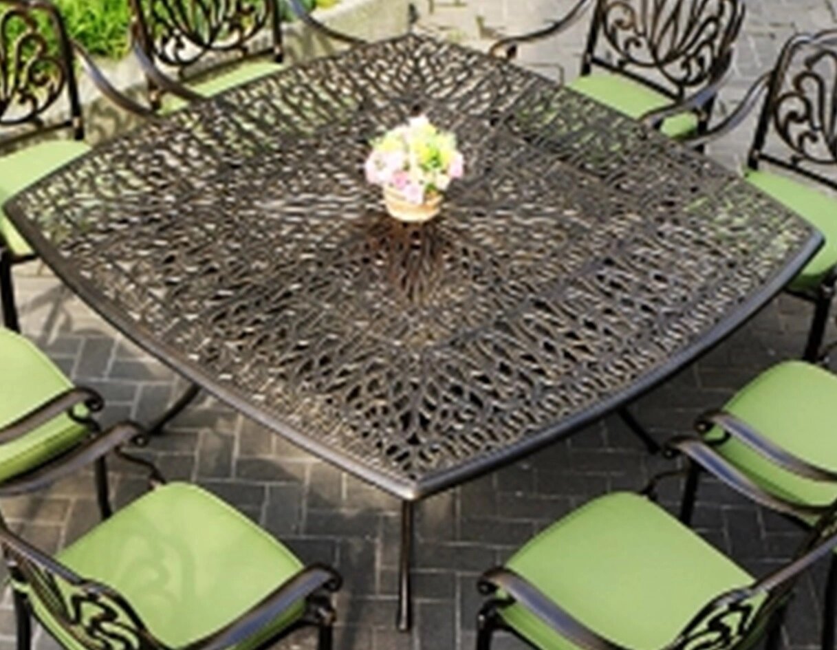Обеденный стол из литого алюминия рассчитана на 8 персон и будет смотреться на террасе или в беседке. Такой металлической мебели из алюминия не страшны перепады температур и различные погодные осадки, она может использоваться как в саду, так и в доме.