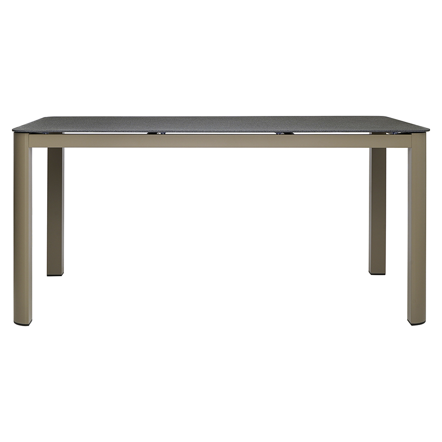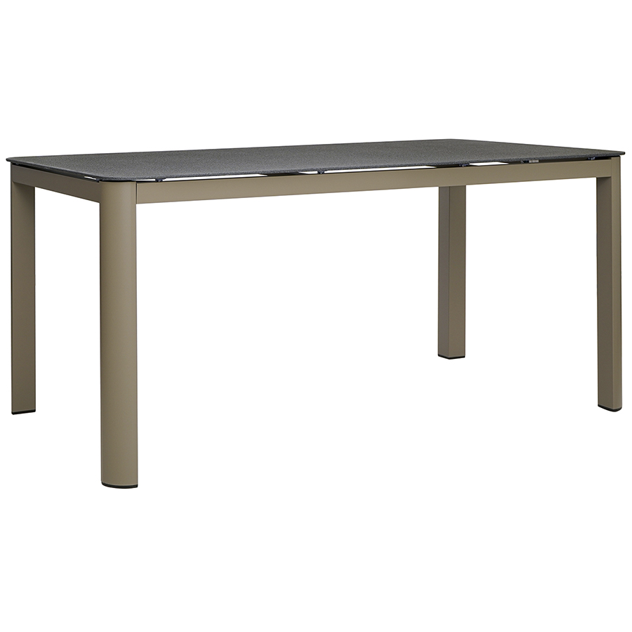 Материал: алюминий, закаленное кварцевое стекло. Размеры: 160х90х75 см. Расстояние между ножками: 87 см и 157 см. Цвет: серо-бежевый.