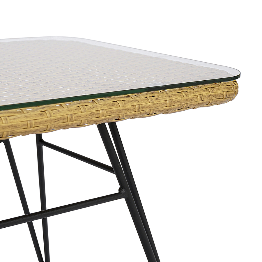 Материал: сталь, искусственный ротанг, стекло. Размеры: 80х40х40 см. Расстояние между ножками: 73 см и 36 см.