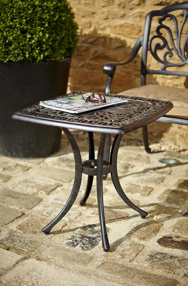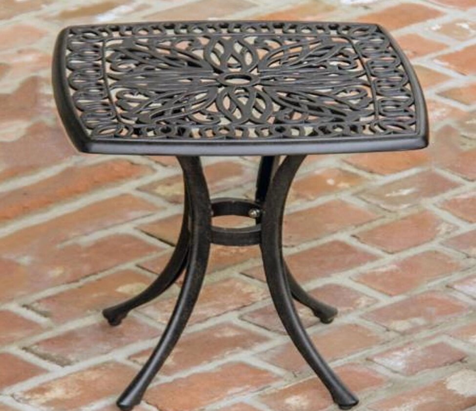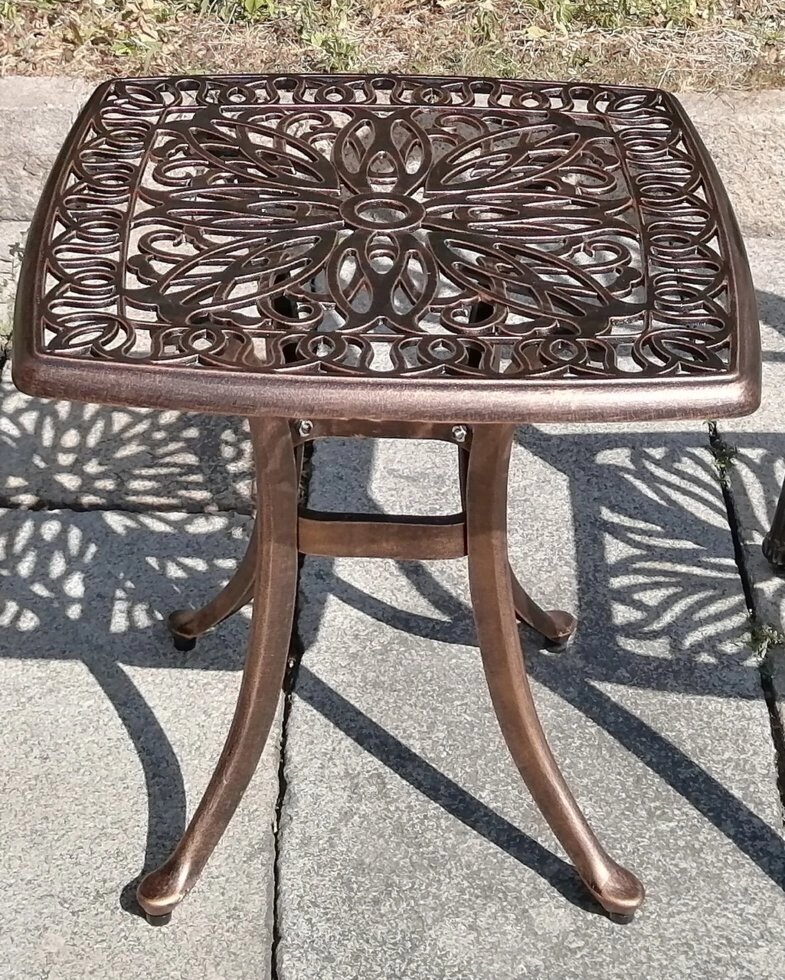 Кофейный стол из литого алюминия в цвете античной бронзы будет шикарно смотреться на веранде или террасе, и в большом загородном доме мебель под ковку будет выглядеть роскошно. Особенностью данного металлического столика из алюминиевого сплава является его небольшой размер.