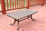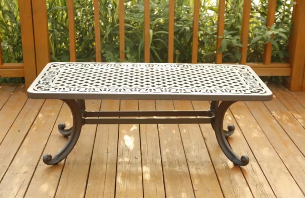 Металлический журнальный столик из литого алюминия от набора мебели для отдыха Venice большой и красивый. Садовая мебель из такого металла легкая и прочная, на улице в беседке она будет смотреться великолепно. Металлический стол можно поставить на веранде или в доме. Цвет: античная бронза. Размеры: 123*64*48 см, вес - 13,5 кг.