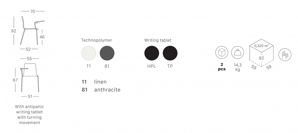 Дизайн:Arter & Citton. Пластиковый стулAliceс корпусом из технополимера на каркасе Ø16 мм с 4 хромированными ножками. Модель идеально подходит для переговорных и офисов и обладает возможностью штабелирования. Столик черного цвета выполнен из технополимера с поворотным механизмом. Характерные эргономичные линии корпуса иконтраст между его непрозрачной передней и глянцевой задней частью являются особенностью этой модели. Данная модель подходит для использования в помещении. Возможные цвета корпуса:лен (11), антрацит (81). Варианты отделки каркаса:хромированный. Посмотреть палитруотделок. Посмотреть технические характеристики. Цена на сайте указана за модель со столиком из технополимера.Для уточнения всех возможных вариантов материала и цвета данного изделия обращайтесь к нашим менеджерам.Характеристики