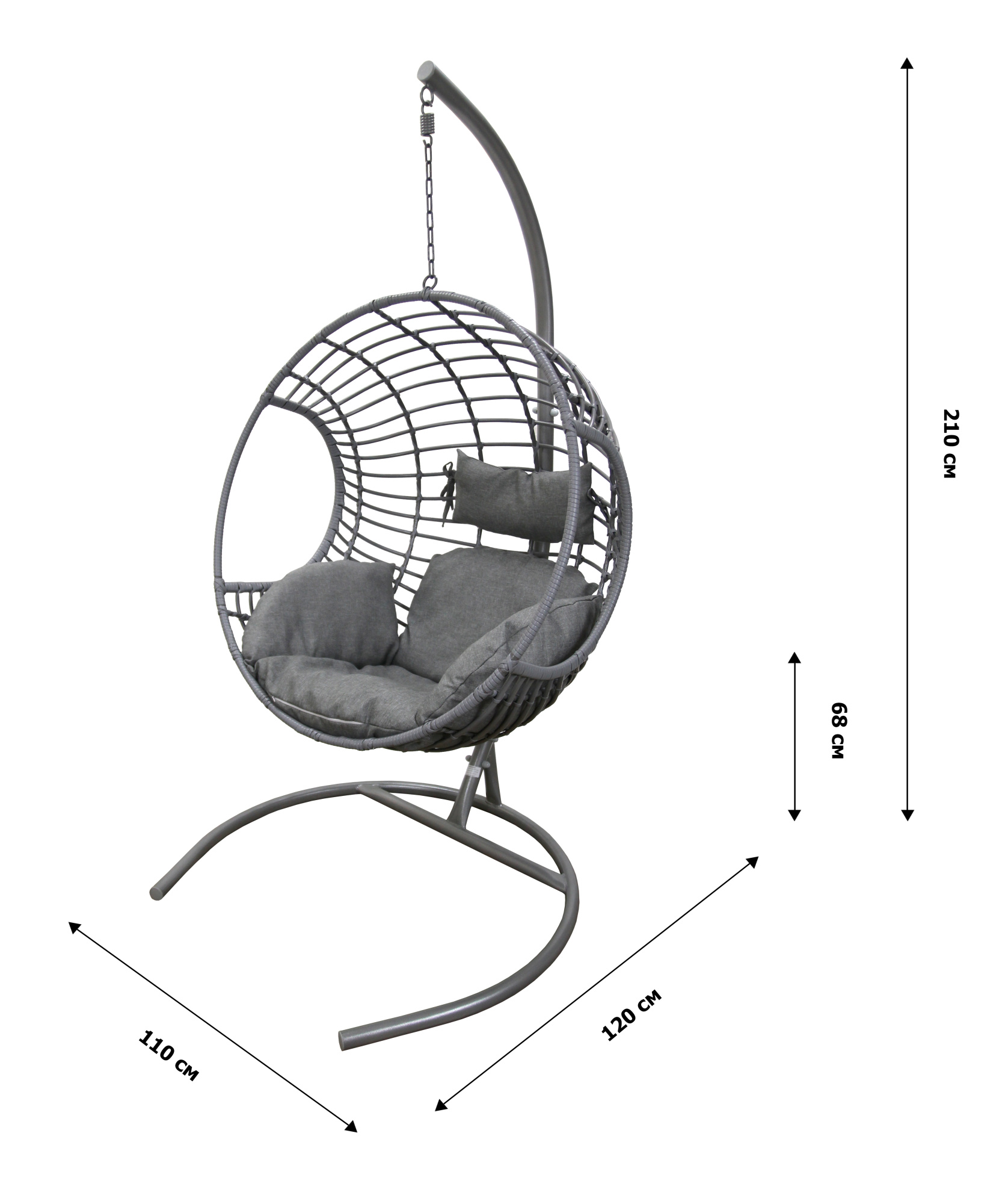 Габариты изделия (Ш/ГхДхВ) : 110х120х210 Габариты элементов (Ш/ГхДхВ) : корзина: 102х81х109 стойка 2 шт: одна 22х10х115,общая длина стойки 196. основание: 110х100х31 Материал каркаса : сталь Труба : Ø42 Покрытие : краска порошковая полимерная Материал корзины : искусственный ротанг Материал чехла мягкого элемента : рогожка MIKKI Тип подвеса : металлическая цепь+пружина Допустимая нагрузка : 120 Требуется сборка : Да Страна производства : РОССИЯ Гарантийный срок : 12 Габариты упаковок (Ш/ГхДхВ) : корзина+подушка 1/3: 109х102х81 основание 3/3: 110х100х31 стойка 2/3: 22х115х10 Цвет каркаса : серый Цвет корзины : серый Цвет чехла мягкого элемента/матраса : серый Наполнитель мягкого элемента/матраса : регенерированное волокно Дополнительно : от пола до сиденья 68 см. Чехол не съемный. Стойка разборная.Характеристики