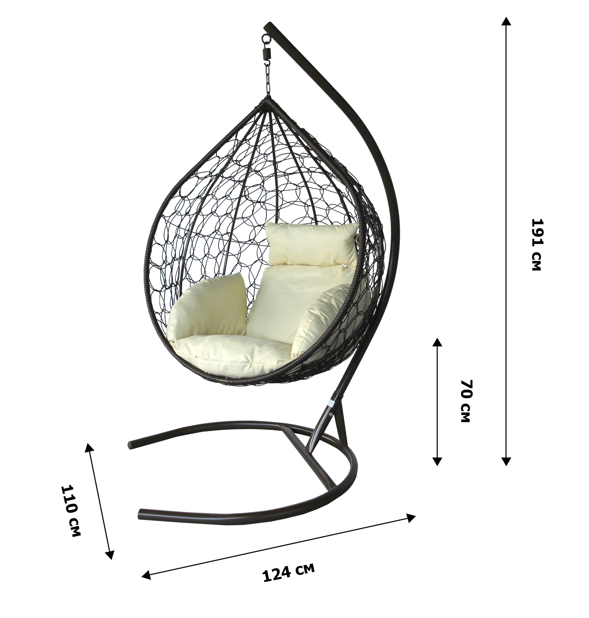 Габариты изделия (Ш/ГхДхВ) : 110х124х191 Габариты элементов (Ш/ГхДхВ) : корзина: 100х120х55 стойка: 52х147х5 основание: 110х100х31 Материал каркаса : сталь Труба : Ø42 Покрытие : краска порошковая полимерная Материал корзины : искусственный ротанг Материал чехла мягкого элемента : водоотталкивающая ткань Тип подвеса : металлическая цепь Допустимая нагрузка : 120 Требуется сборка : Да Страна производства : РОССИЯ Гарантийный срок : 12 Габариты упаковок (Ш/ГхДхВ) : корзина+подушка 1/3: 100х120х55 основание 3/3: 110х100х31 стойка 2/3: 52х147х5 Цвет каркаса : коричневый Цвет корзины : коричневый Цвет чехла мягкого элемента/матраса : бежевый Наполнитель мягкого элемента/матраса : регенерированное волокно Дополнительно : от пола до сиденья 70 см.Характеристики