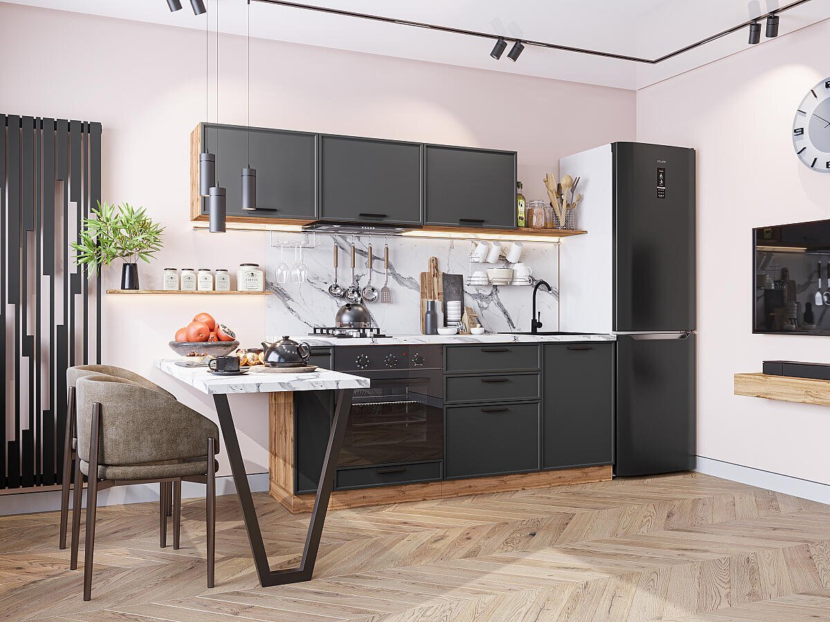 Кухня Фрейм — это сочетание маленьких незаметных деталей, которые складываются в общую композицию удобства комфорта и надежности. Выглядит такая кухня одновременно легкой и функциональной. Гладкие фасады смотрятся оригинально и стильно, а тонкая рамка по периметру разбавит — однотонность — гарнитура, выделяя центральные части шкафов, что делает его более эстетичным и привлекательным. Однотонная — поверхность — фасадов гармонично сочетается с темной фурнитурой и структурой дерева. Фасады с покрытием ПЭТ можно отнести к антивандальным — У них хорошая устойчивость к царапинам и выцветанию, за счет чего фасады сохранят свой внешний вид на протяжении многих лет.