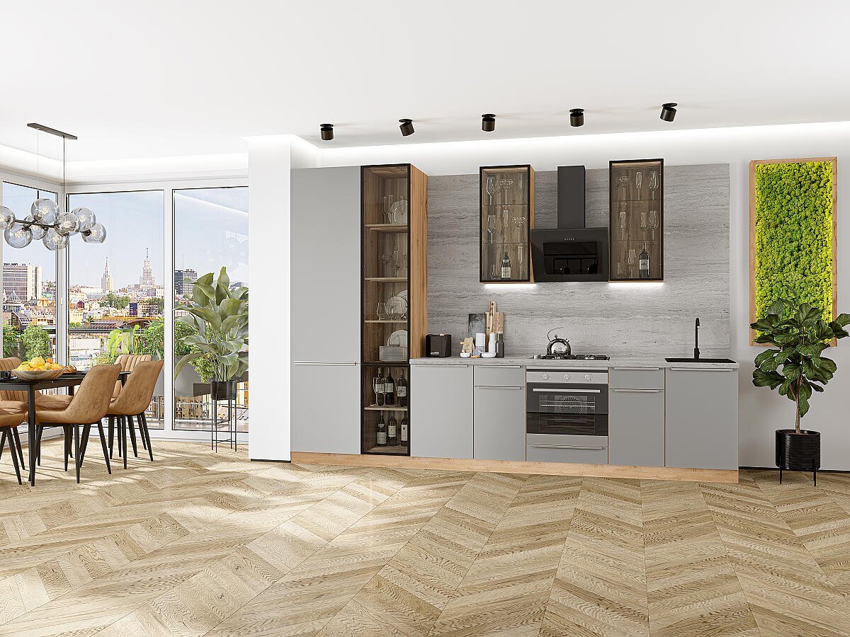 • Прямая модульная кухня Фьюжн-08 Silky Light Grey - Дуб Вотан 2340*3400*600