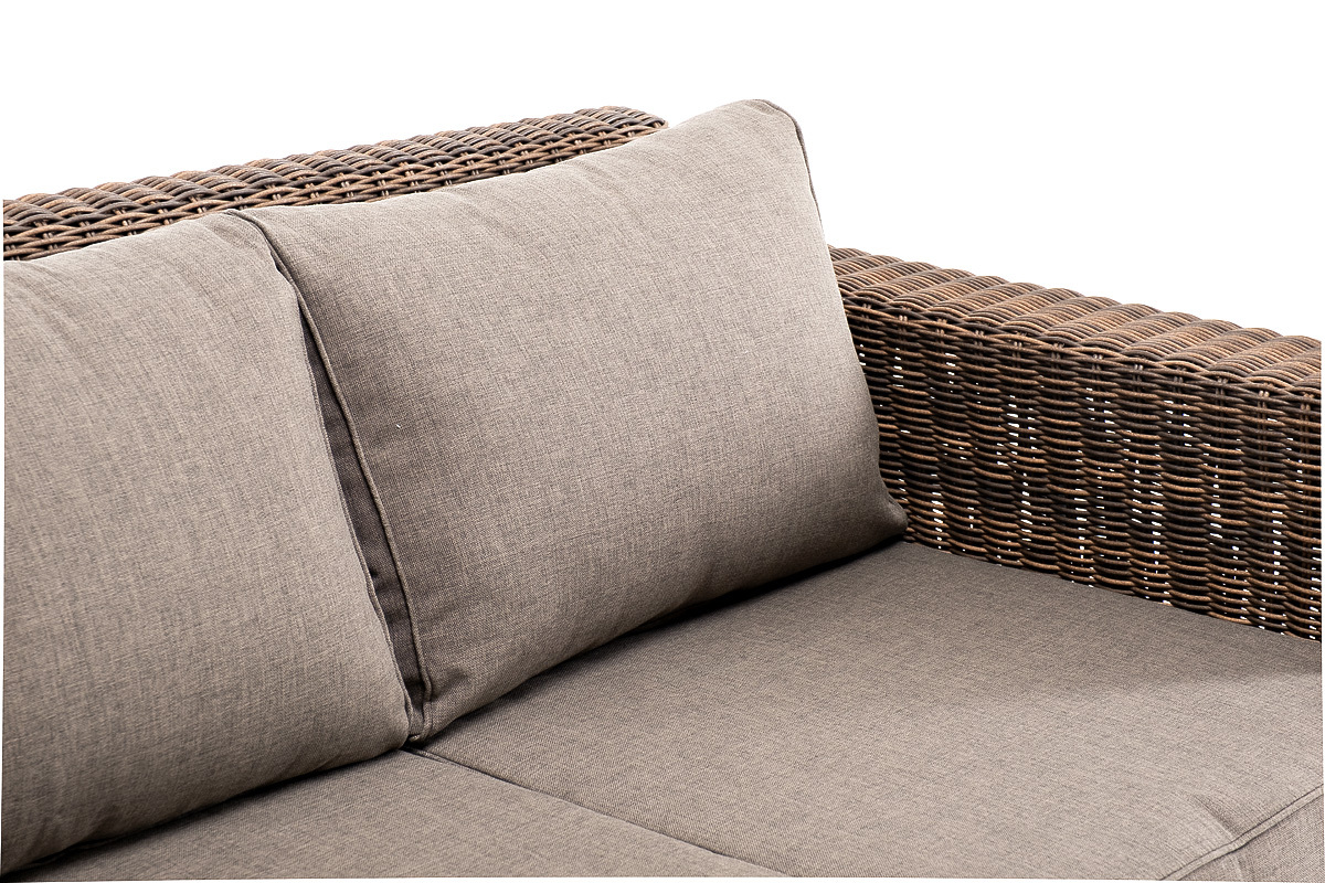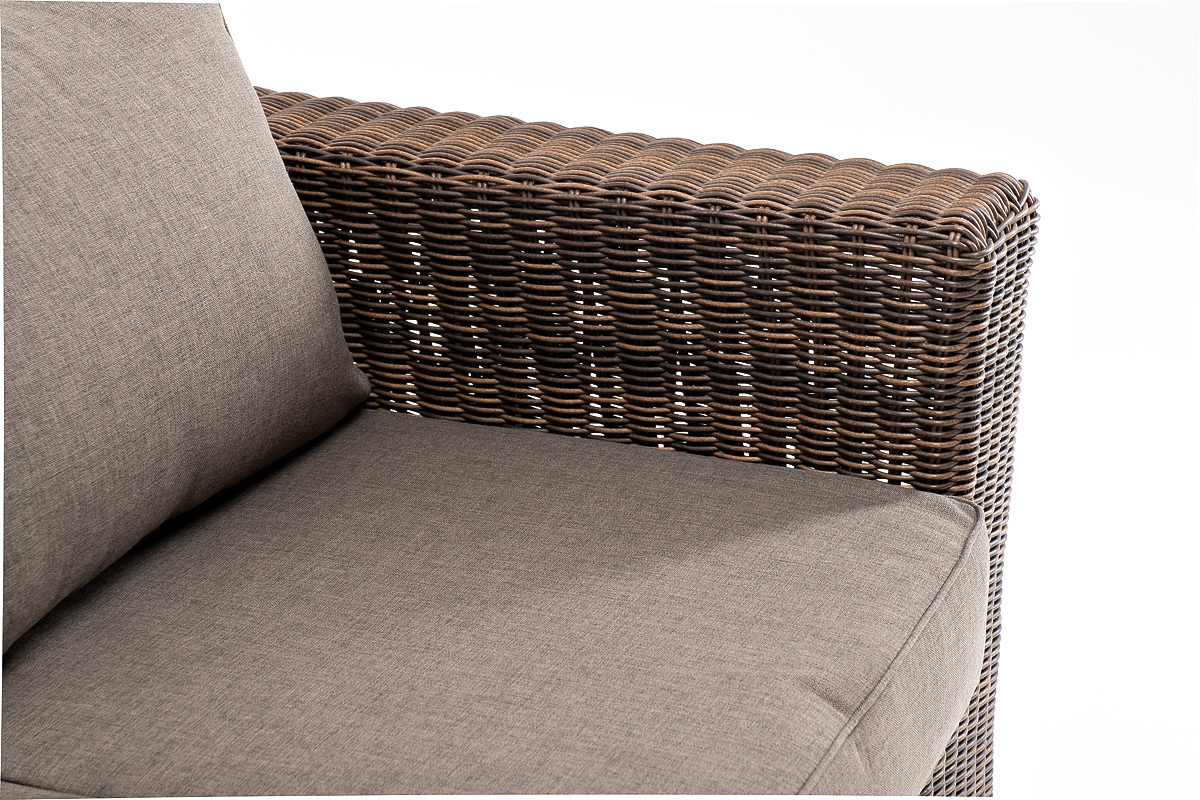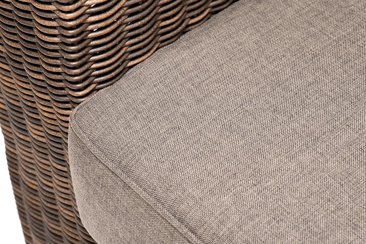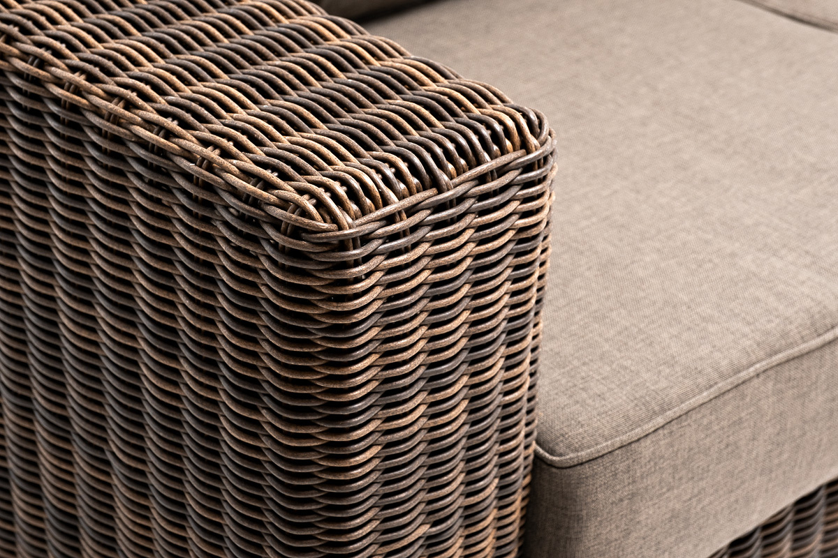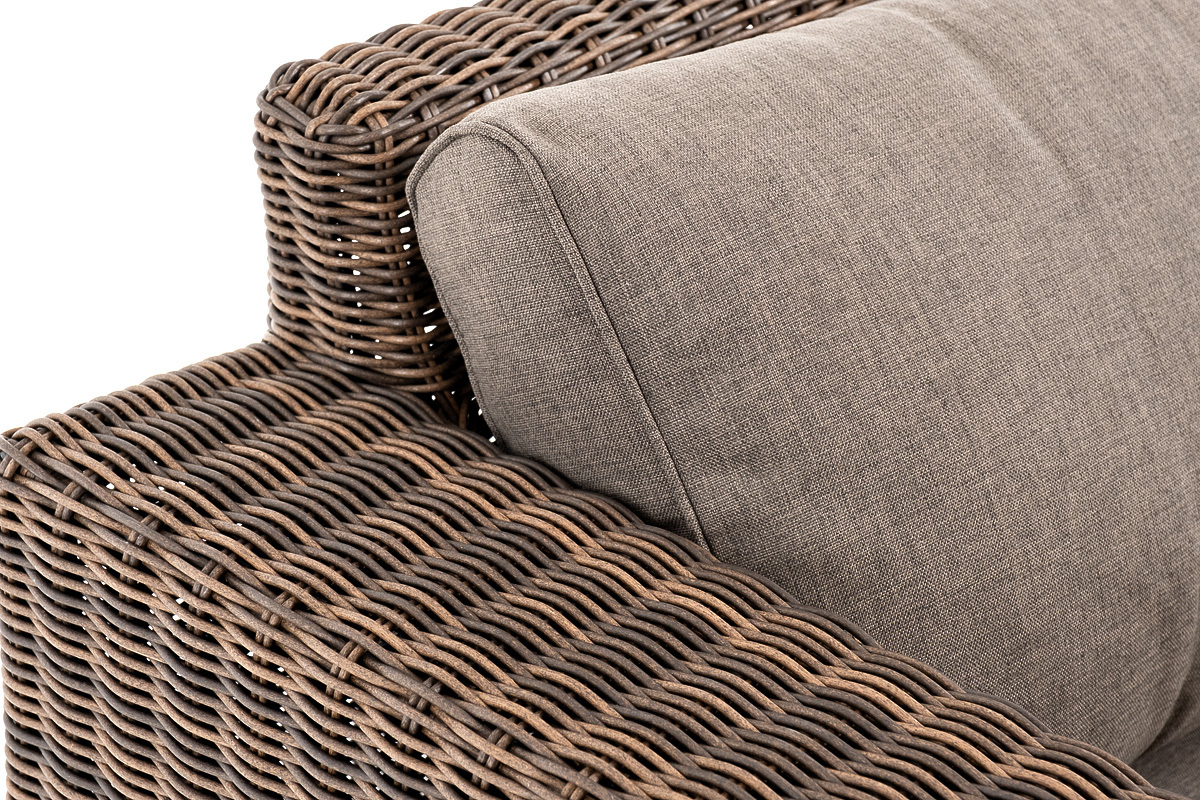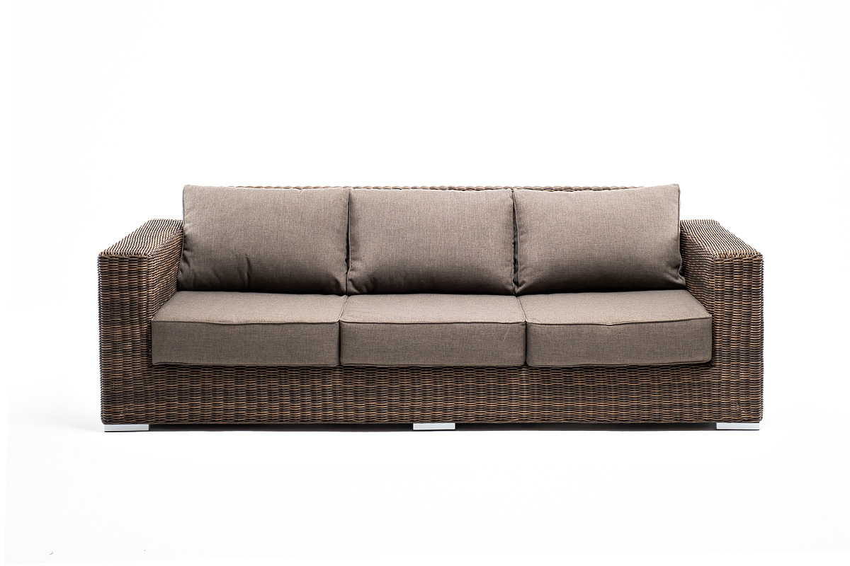 Диван «Боно» подходит для размещения сразу трех персон. Его основа из прочного алюминиевого каркаса. Размер модели – 2300×900×775 мм, толщина подушки: 150 мм, вес: 45 кг. Ручное круглое плетение является основным декоративным элементом мебели. Оно выполнено из искусственного ротанга в коричневом цвете. В комплекте с трехместным диваном идут мягкие подушки для комфортного расположения. Чехлы съёмные серого цвета из высококлассного полиэстера с плотностью 300гр/м2. Защитные свойства ткани усиливаются при помощи влагоотталкивающей пропитки.Бренд | 4SIS |