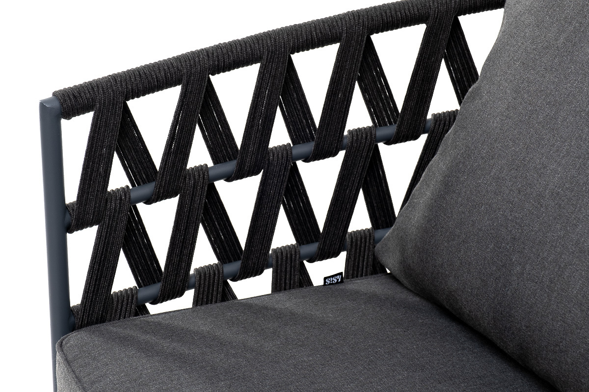 Двухместный диван «Диего» с подушками в комплекте. Диван имеет алюминиевый каркас, окрашенный порошковой краской в темно-серый (RAL7024) цвет. Боковины каркаса и спинка вручную оплетены роупом - эластичными синтетическими лентами, изготовленными из высокопрочных полиэфирных волокон. Цвет оплетки - темно-серый. Подушки состоят из наполнителя и съёмных чехлов, которые обработаны влагоотталкивающей пропиткой темно-серого цвета. Материал - 100% полиэстер, плотностью 300гр/м2. Размер плетеного дивана: 1580×720×770 мм.Бренд | 4SIS |
