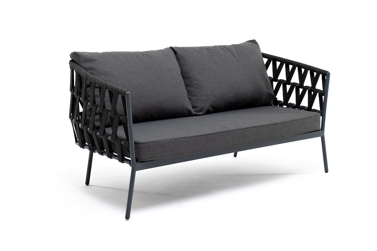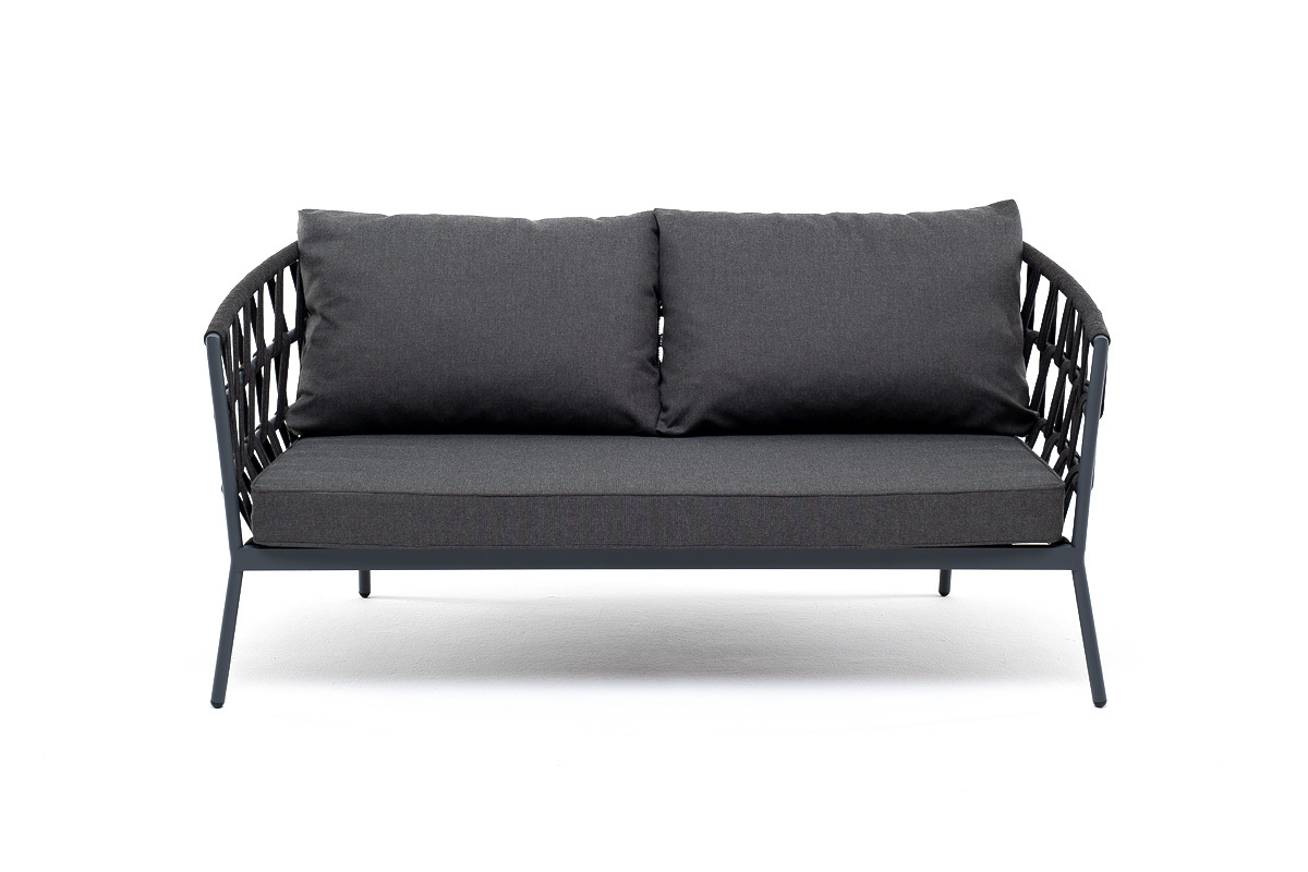 "Диего" диван 2-местный плетеный из роупа, каркас алюминий темно-серый (RAL7024) муар, роуп темно-серый круглый, ткань темно-серая 027