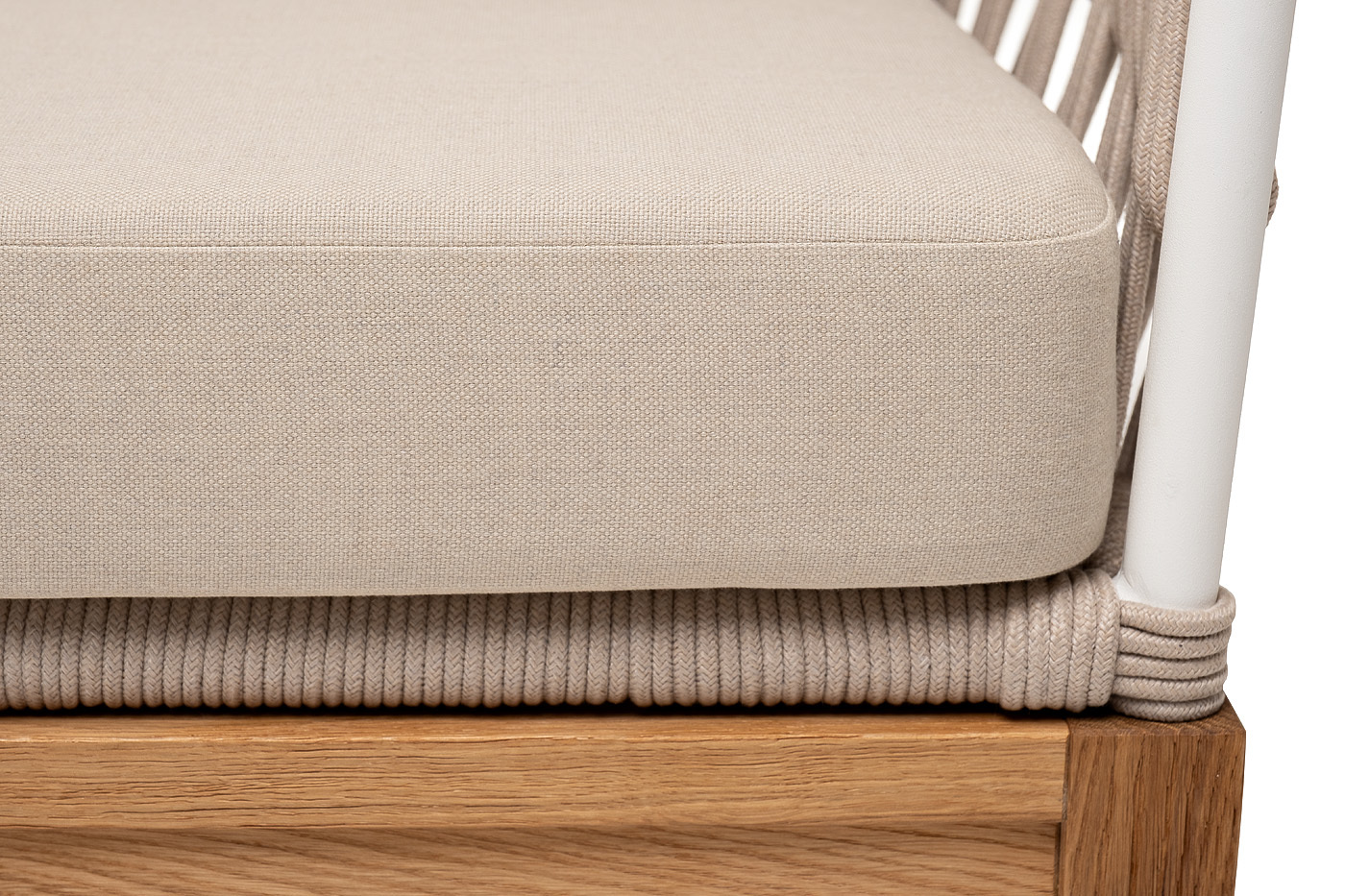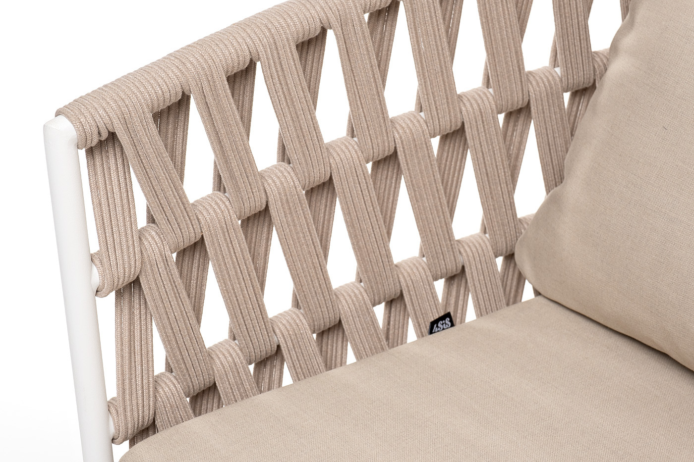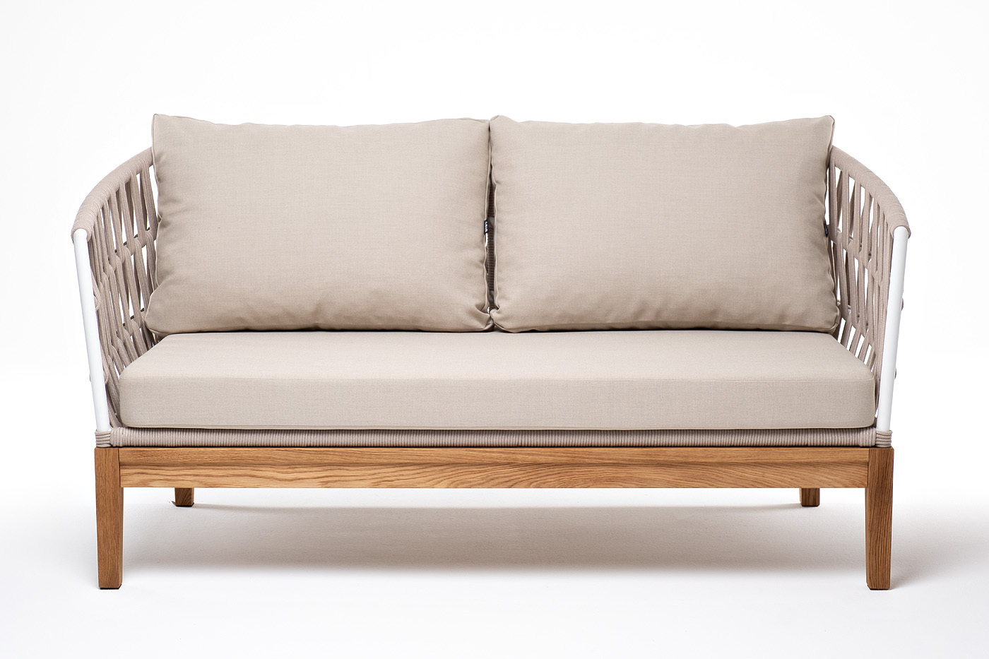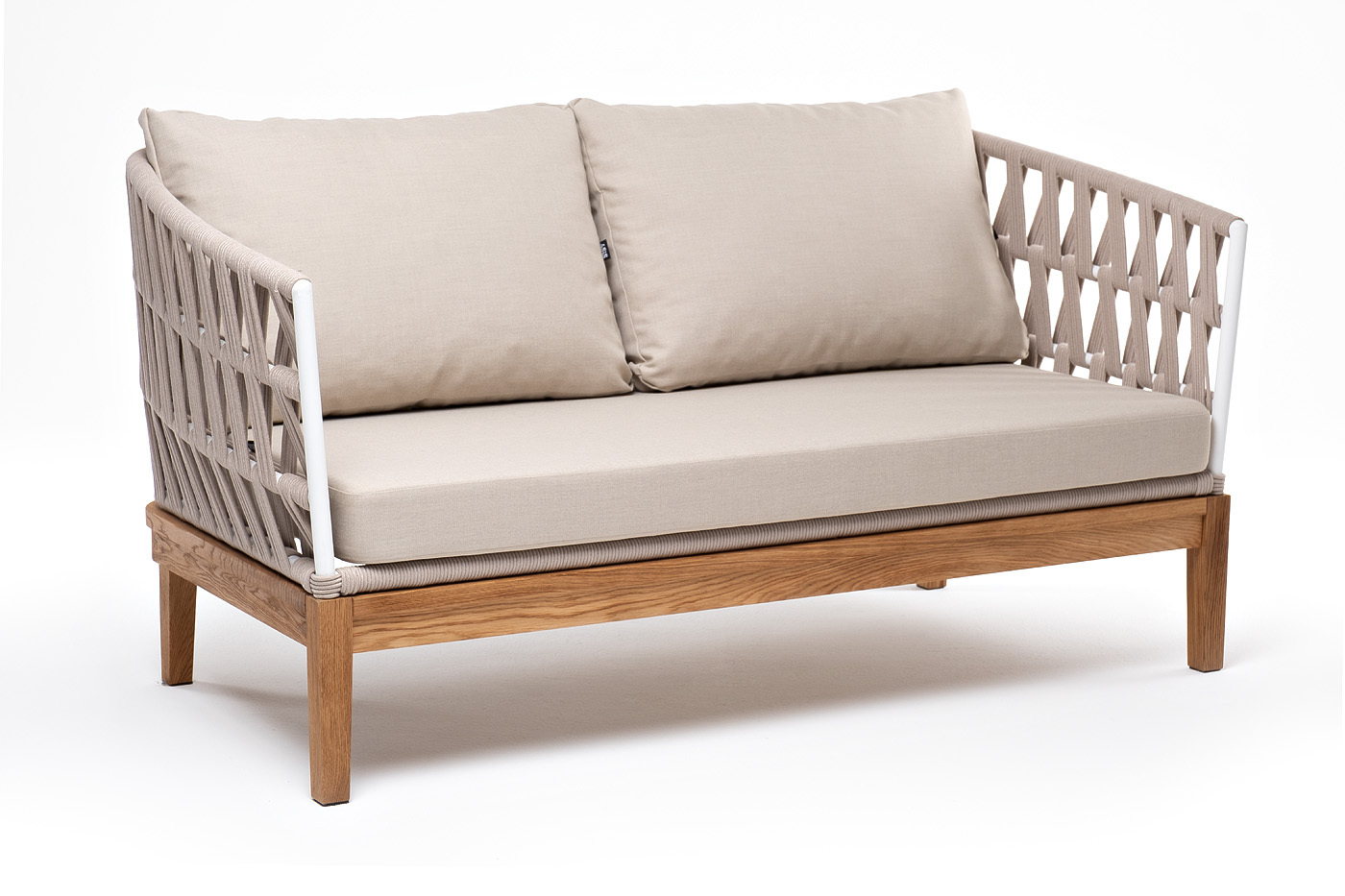Двухместный диван «Диего» с подушками в комплекте. Основание кресла - дуб, каркас из алюминия светло-серого (RAL7035) цвета. Боковины каркаса вручную оплетены роупом - эластичными синтетическими лентами, изготовленными из высокопрочных полиэфирных волокон. Цвет оплетки - бежевый. Подушки со съёмными чехлами, которые обработаны влагоотталкивающей пропиткой. Материал - 100% полиэстер, плотностью 300гр/м2. Размер кресла: 1580×720×800 мм.Бренд | 4SIS |
