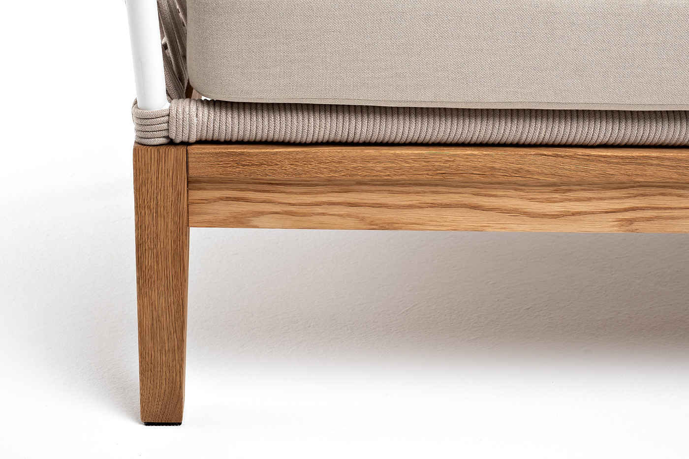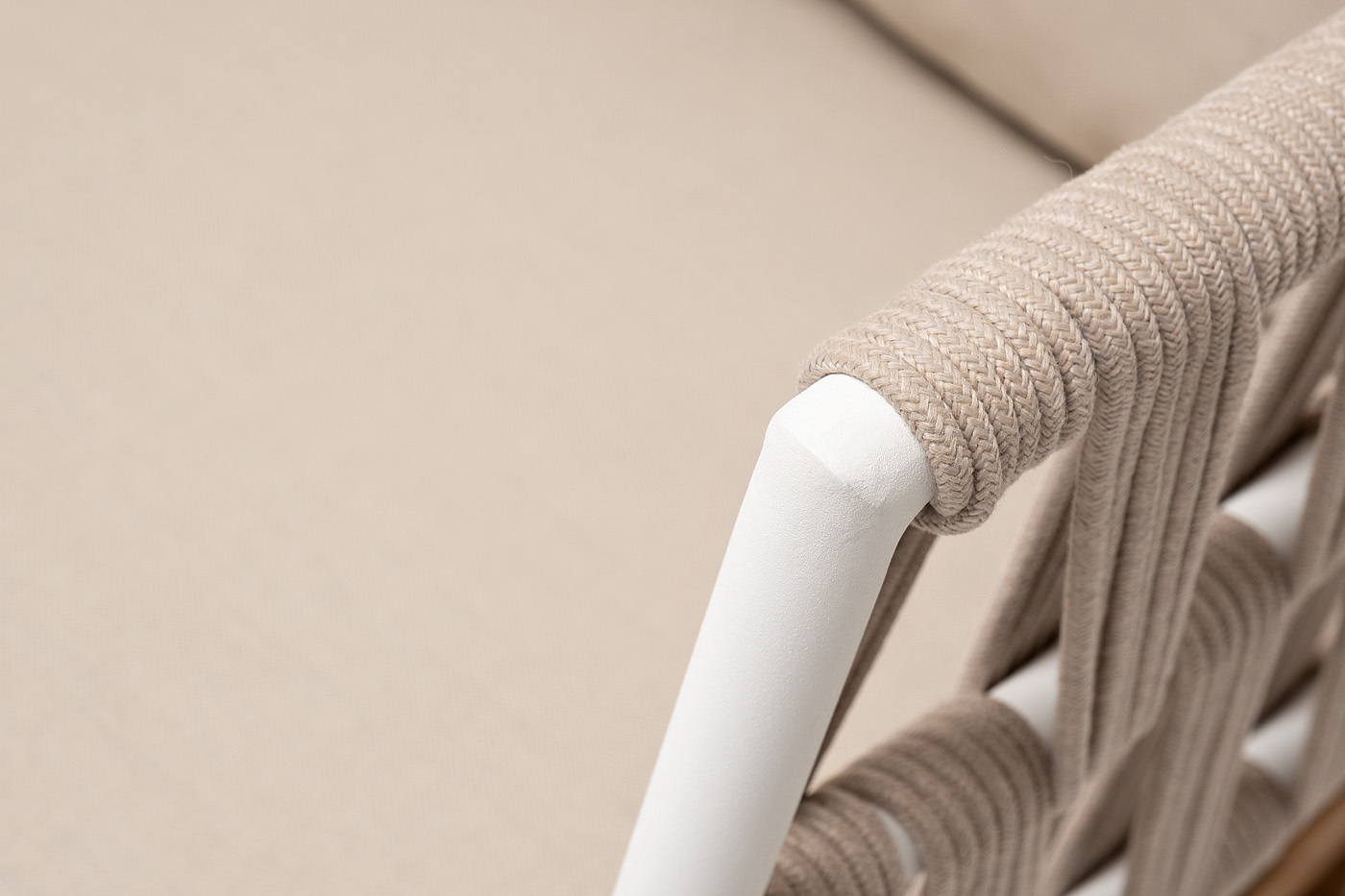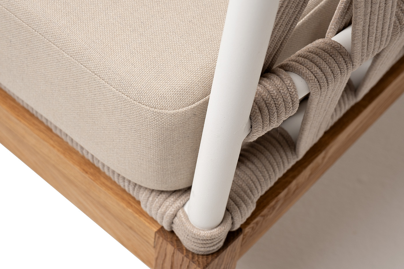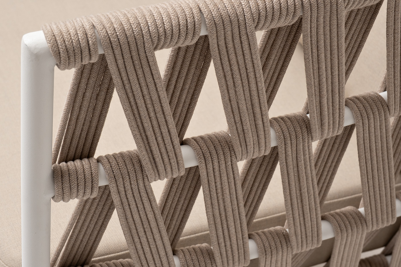 Двухместный диван «Диего» с подушками в комплекте. Основание кресла - дуб, каркас из алюминия светло-серого (RAL7035) цвета. Боковины каркаса вручную оплетены роупом - эластичными синтетическими лентами, изготовленными из высокопрочных полиэфирных волокон. Цвет оплетки - бежевый. Подушки со съёмными чехлами, которые обработаны влагоотталкивающей пропиткой. Материал - 100% полиэстер, плотностью 300гр/м2. Размер кресла: 1580×720×800 мм.Бренд | 4SIS |