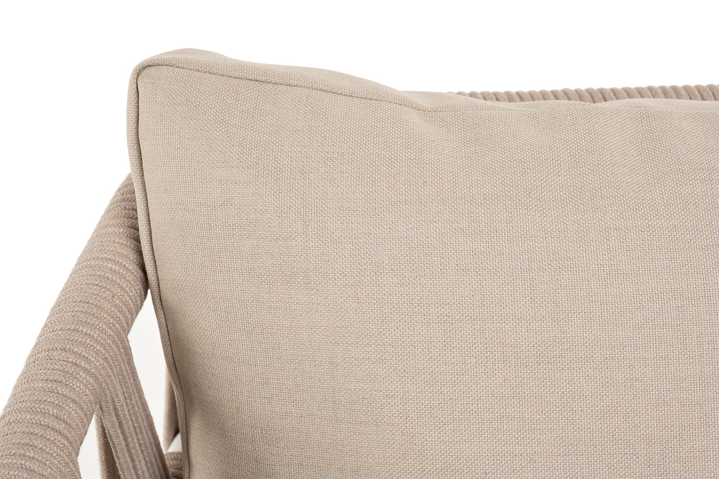 "Диего" диван 2-местный плетеный из роупа, основание дуб, каркас алюминий светло-серый (RAL7035) шагрень, роуп бежевый круглый, ткань бежевая 15052 | |