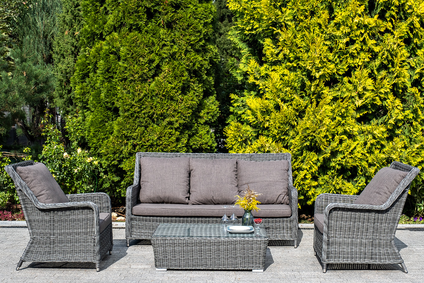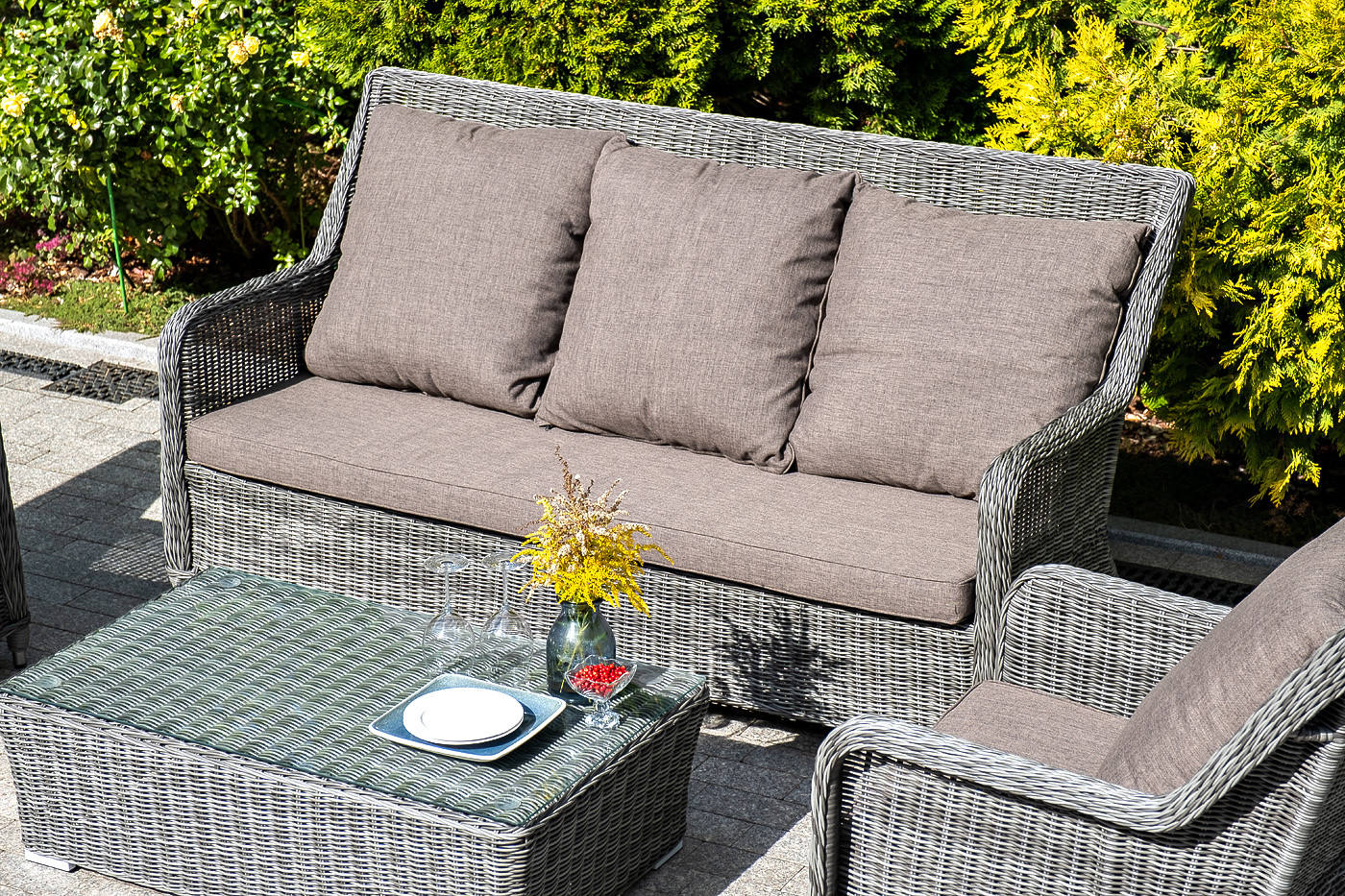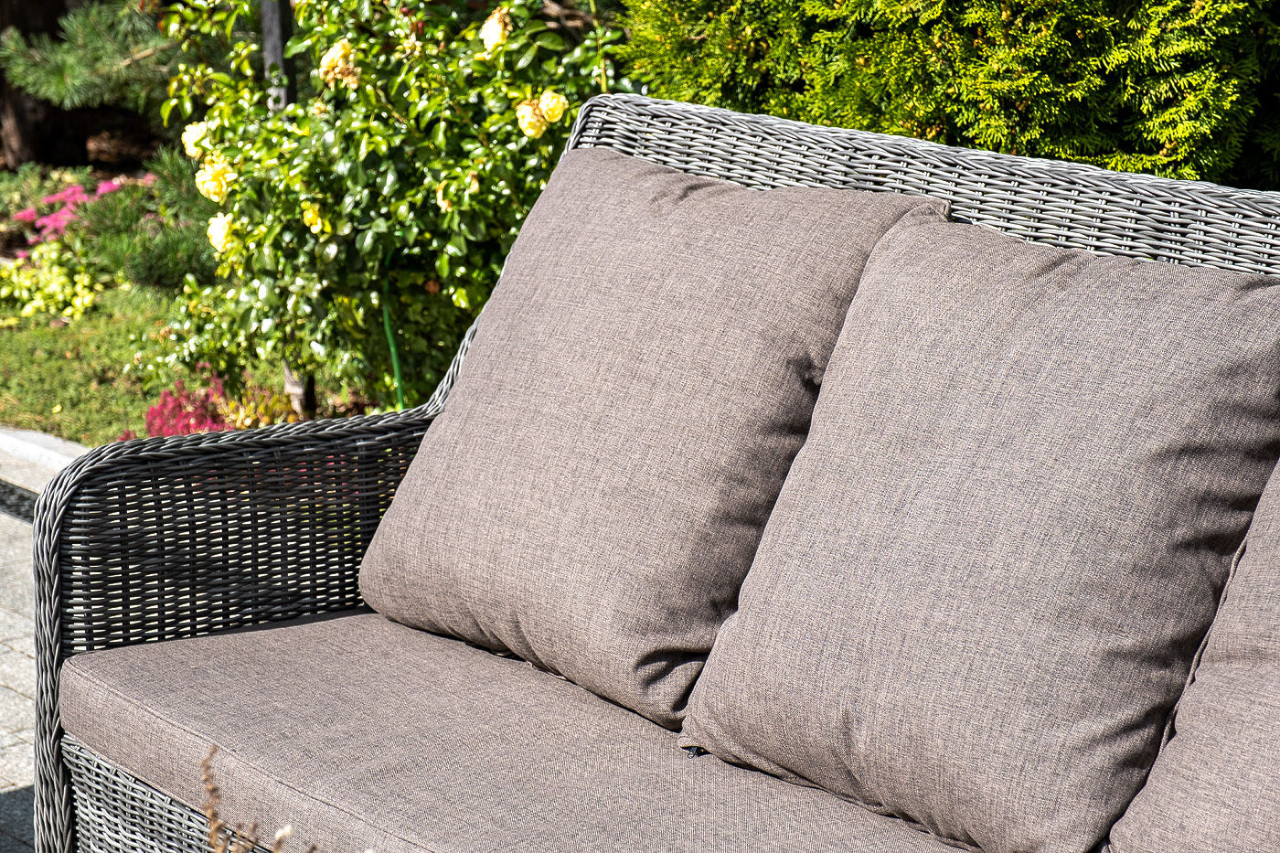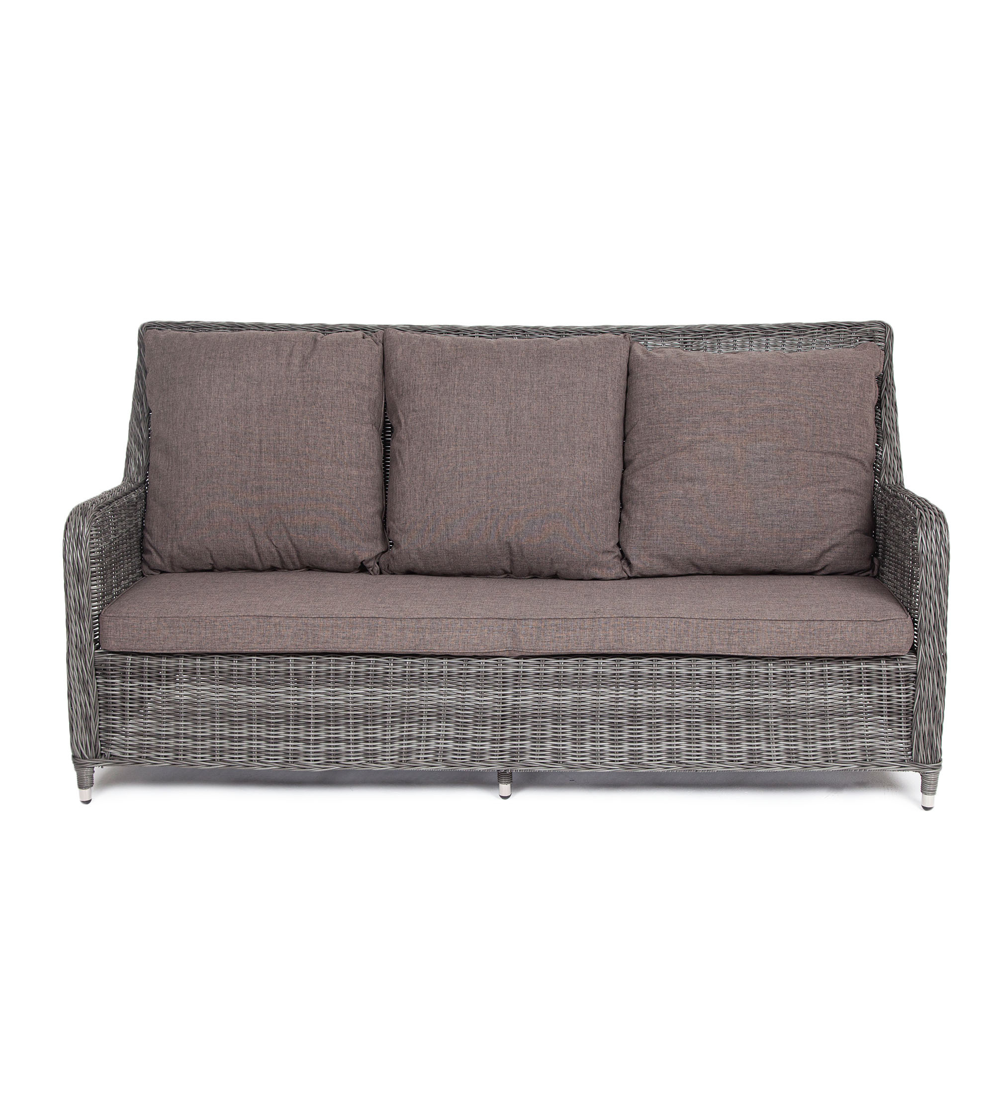 Диван «Гляссе» подходит для размещения сразу трех персон. Его основа из прочного алюминиевого каркаса. Размер модели – 1900×880×990 мм. Ручное круглое плетение является основным декоративным элементом мебели. Оно выполнено из искусственного ротанга в цвете графит. В комплекте с трехместным диваном идут мягкие подушки для комфортного расположения. Чехлы съёмные серого цвета из высококлассного полиэстера с плотностью 300гр/м2. Защитные свойства ткани усиливаются при помощи влагоотталкивающей пропитки.Бренд | 4SIS |