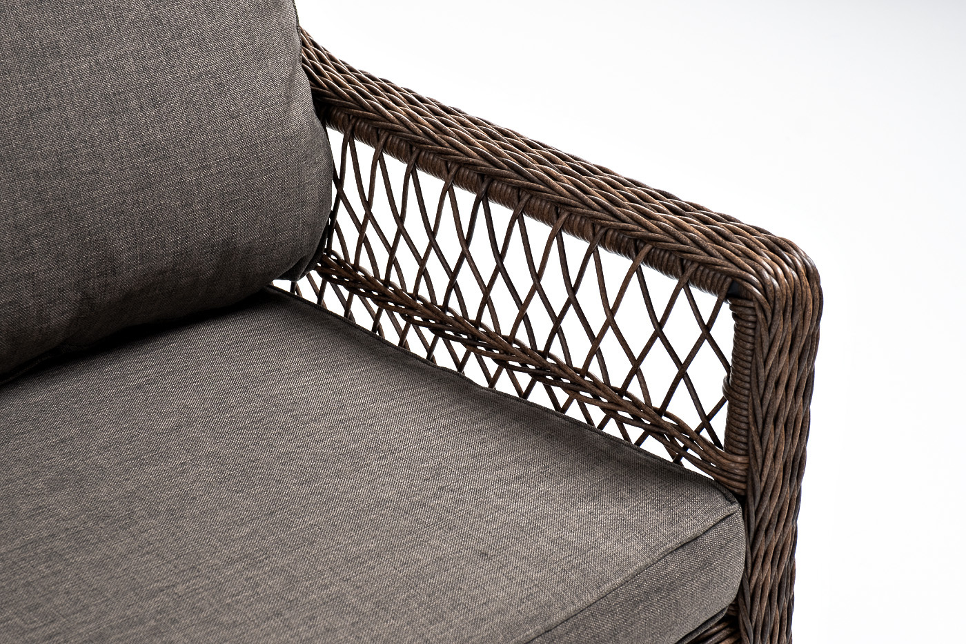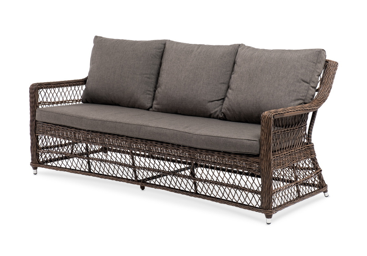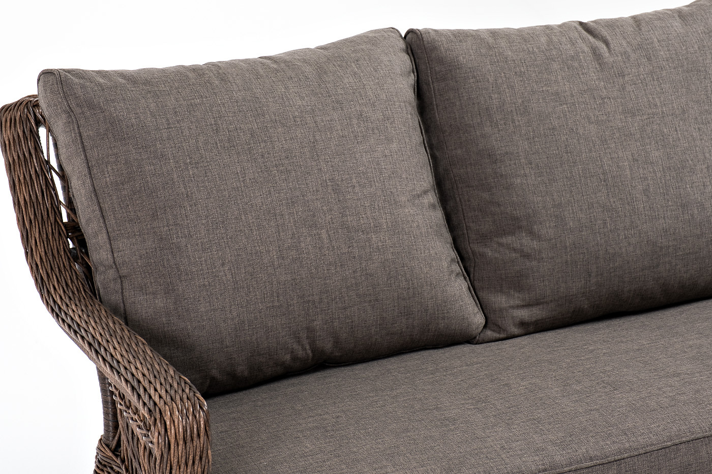 Диван «Гранд Латте» рассчитан для размещения трех человек. Он имеет алюминиевый каркас, который выдерживает большой вес. Размер – 1875×830×850 мм. Модель выполнена с помощью ручного круглого плетения из искусственного ротанга. Трехместный диван представлен в коричневом цвете. В комплект к дивану входят подушки. Съёмные чехлы для них выполнены в сером цвете. Они пошиты из износостойкого полиэстера, плотность которого составляет 300гр/м2. Предусмотрена влагоотталкивающая пропитка, улучшающая эксплуатационные свойства изделия.Бренд | 4SIS |