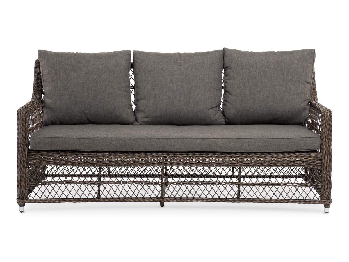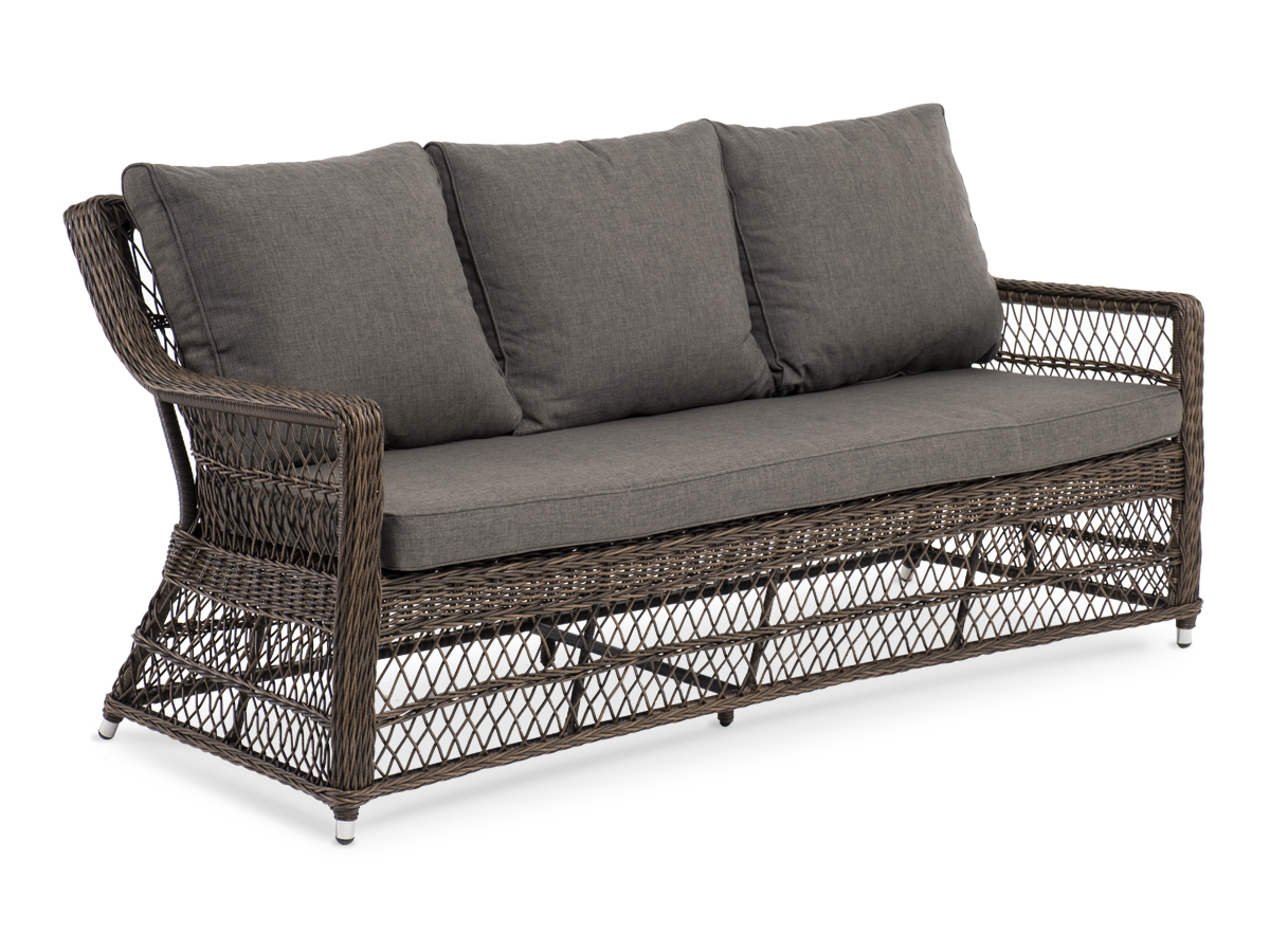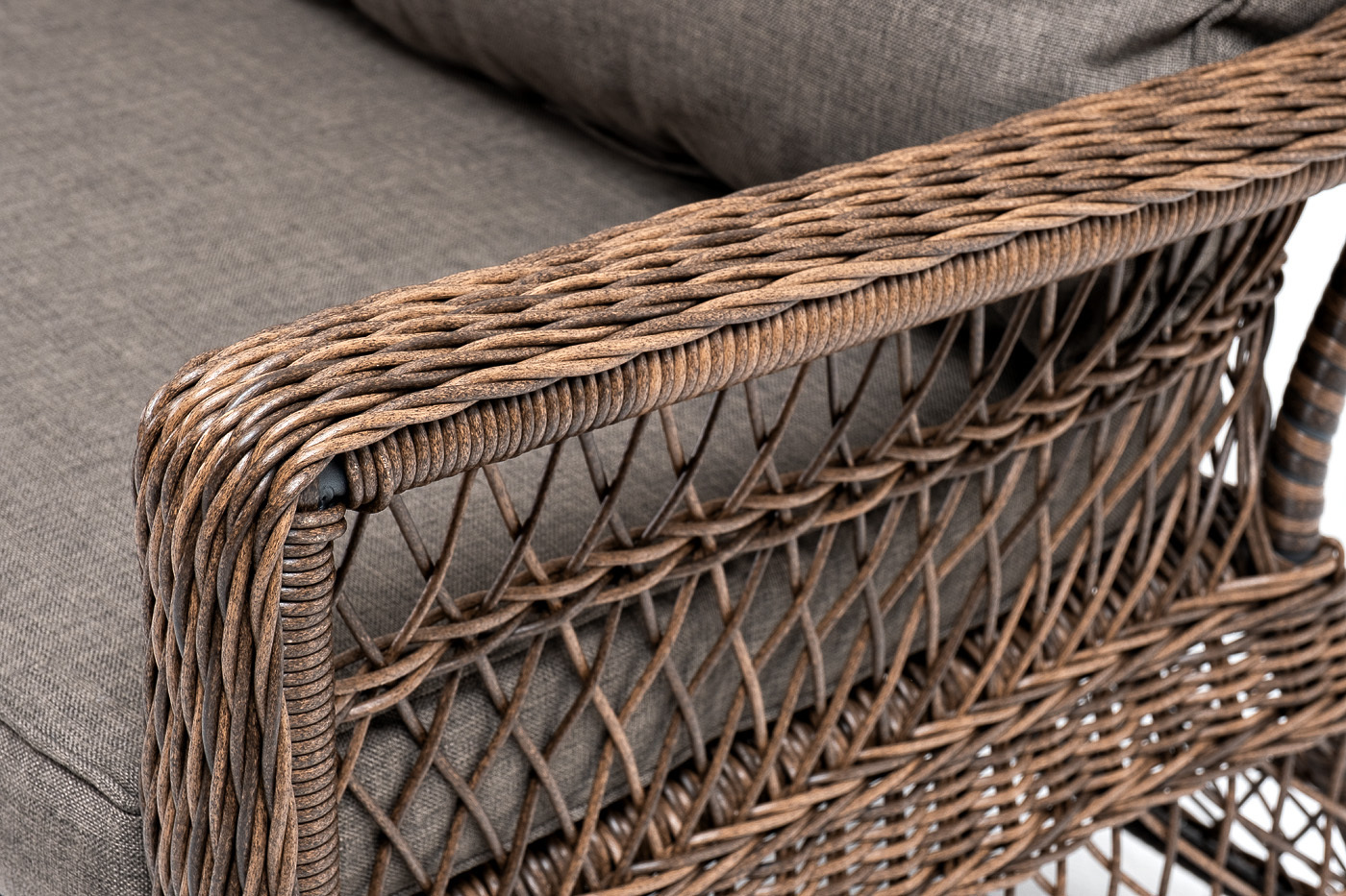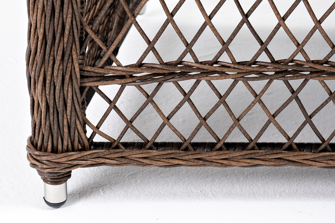 Диван «Гранд Латте» рассчитан для размещения трех человек. Он имеет алюминиевый каркас, который выдерживает большой вес. Размер – 1875×830×850 мм. Модель выполнена с помощью ручного круглого плетения из искусственного ротанга. Трехместный диван представлен в коричневом цвете. В комплект к дивану входят подушки. Съёмные чехлы для них выполнены в сером цвете. Они пошиты из износостойкого полиэстера, плотность которого составляет 300гр/м2. Предусмотрена влагоотталкивающая пропитка, улучшающая эксплуатационные свойства изделия.Бренд | 4SIS |