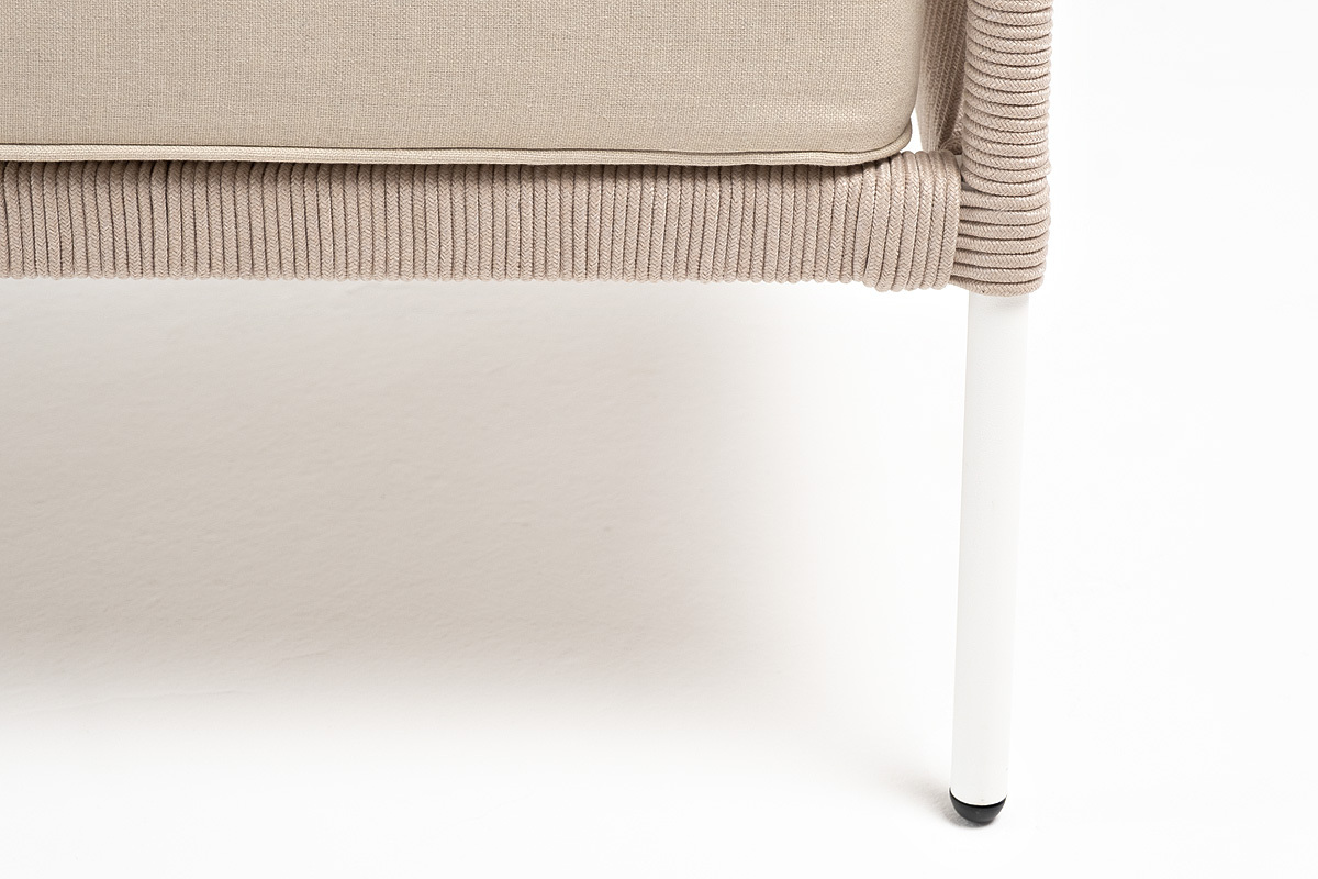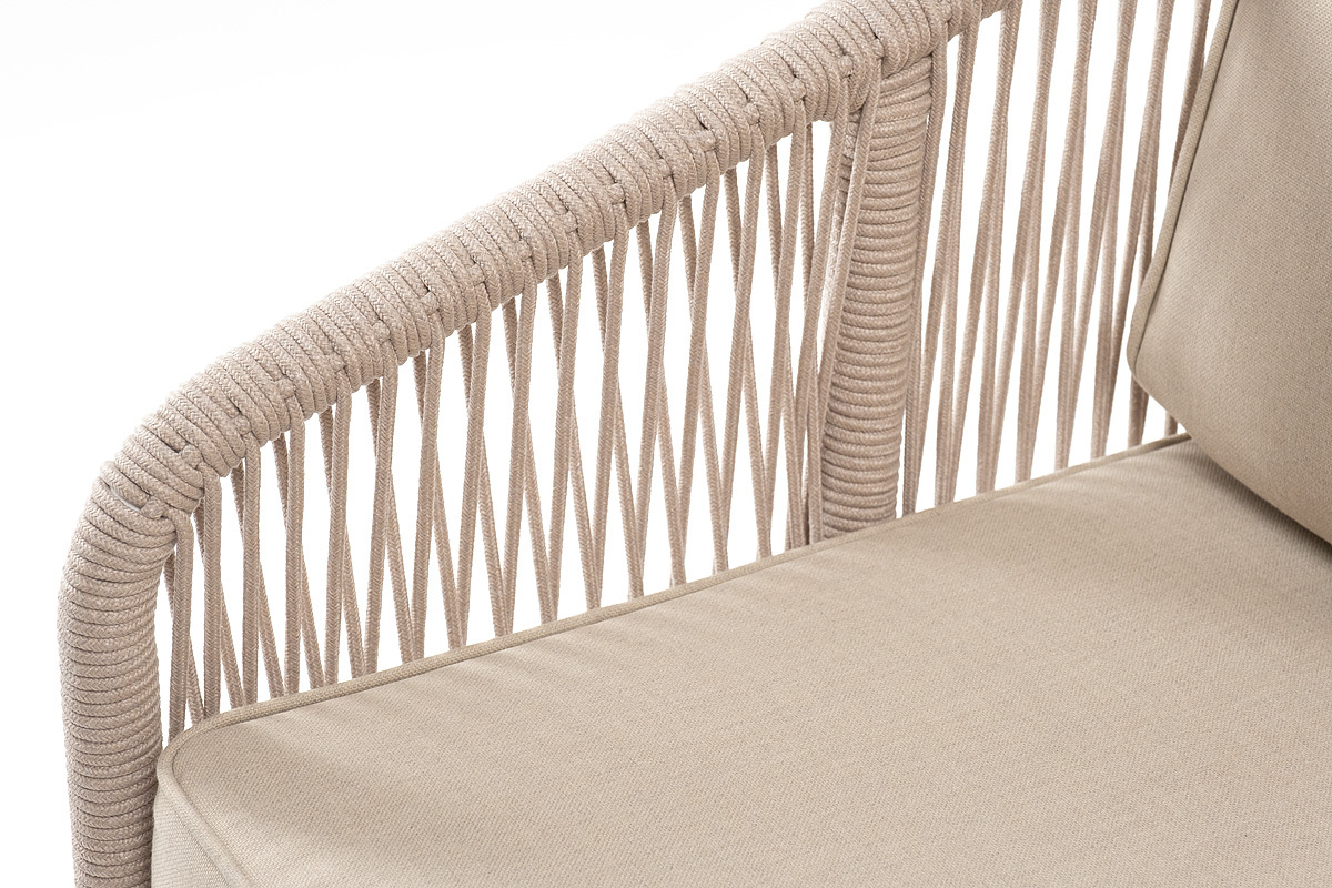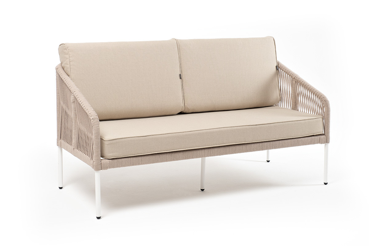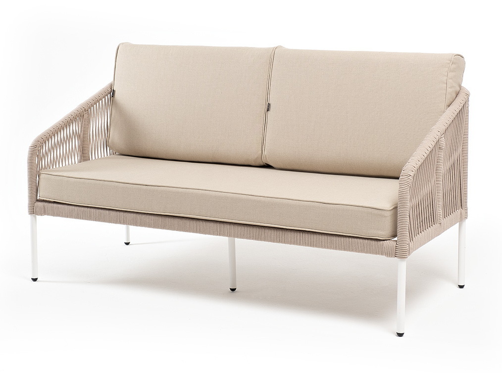Двухместный диван «Канны» с подушками в комплекте. Диван имеет алюминиевый каркас, окрашенный порошковой краской в белый цвет. Боковины каркаса вручную оплетены роупом - эластичными синтетическими лентами, изготовленными из высокопрочных полиэфирных волокон бежевого цвета. Подушки состоят из наполнителя и съёмных чехлов. Материал - 100% полиэстер, плотностью 300гр/м2. Размер плетеного дивана: 1500×700×750 мм.Бренд | 4SIS |