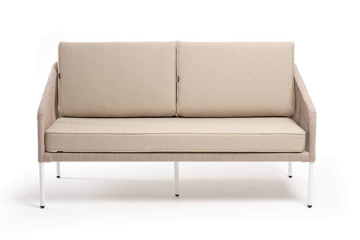 "Канны" диван 2-местный плетеный из роупа, каркас алюминий белый муар, роуп бежевый круглый, ткань бежевая 15052