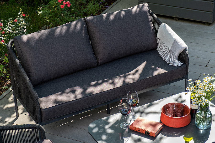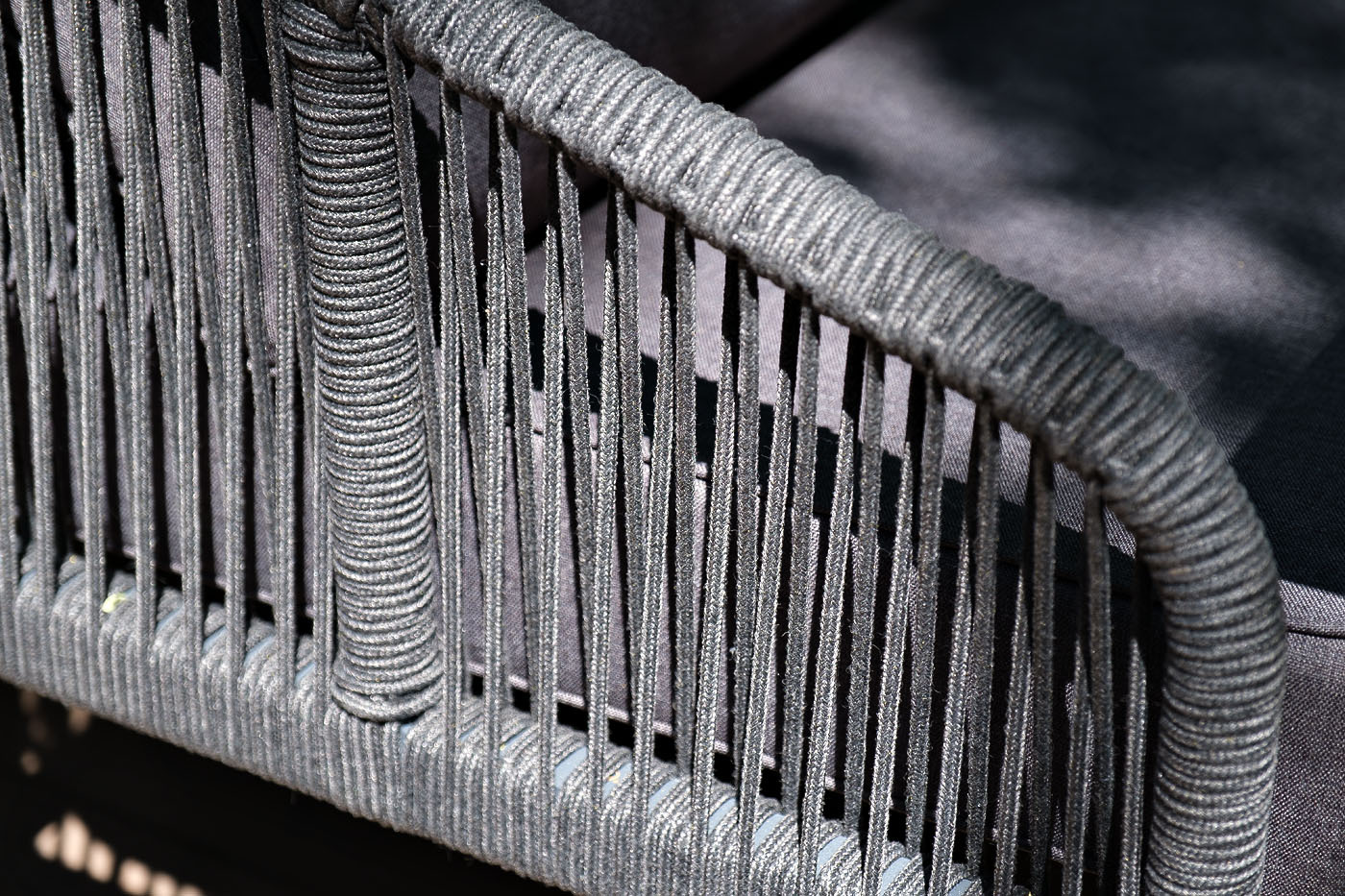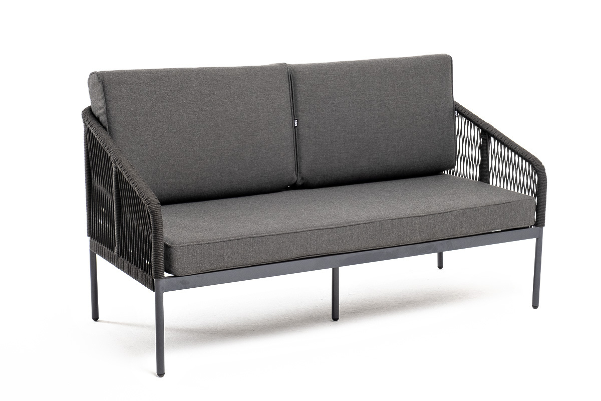 "Канны" диван 2-местный плетеный из роупа, каркас алюминий темно-серый (RAL7024) муар, роуп темно-серый круглый, ткань темно-серая 027