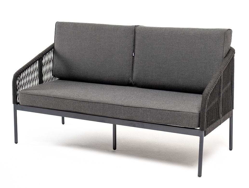 "Канны" диван 2-местный плетеный из роупа, каркас алюминий темно-серый (RAL7024) муар, роуп темно-серый круглый, ткань темно-серая 027, выс. пос.45см