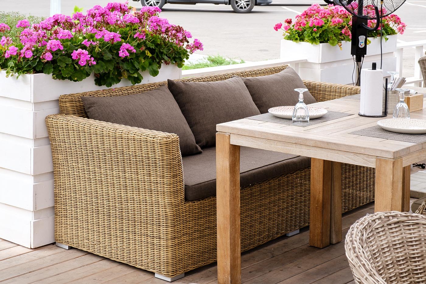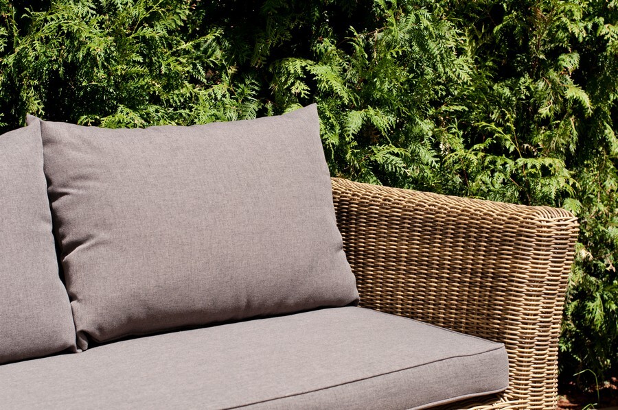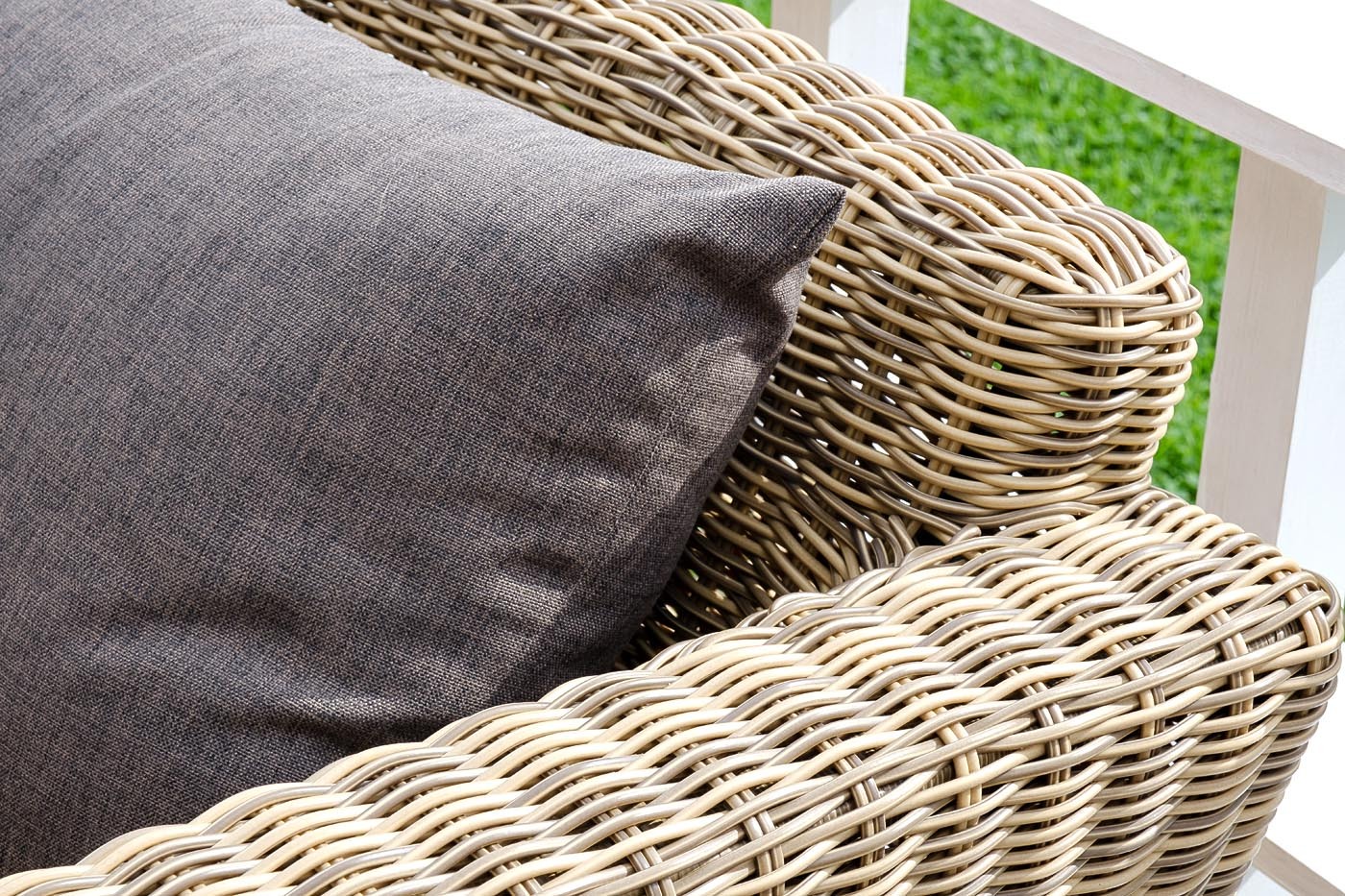 Диван «Капучино» предназначается для размещения трех человек. Его основание изготовлено из алюминиевого каркаса, способного выдерживать большие нагрузки. Размер модели – 2220×865×815 мм. Мебель декорирована ручным круглым плетением, выполненным из искусственного ротанга соломенного цвета. Трехместный диван укомплектован мягкими подушками, которые защищены съёмными чехлами в сером оттенке. При их пошиве используется износостойкий полиэстер, плотность которого достигает 300гр/м2. Предусмотрена влагоотталкивающая пропитка.Бренд | 4SIS |