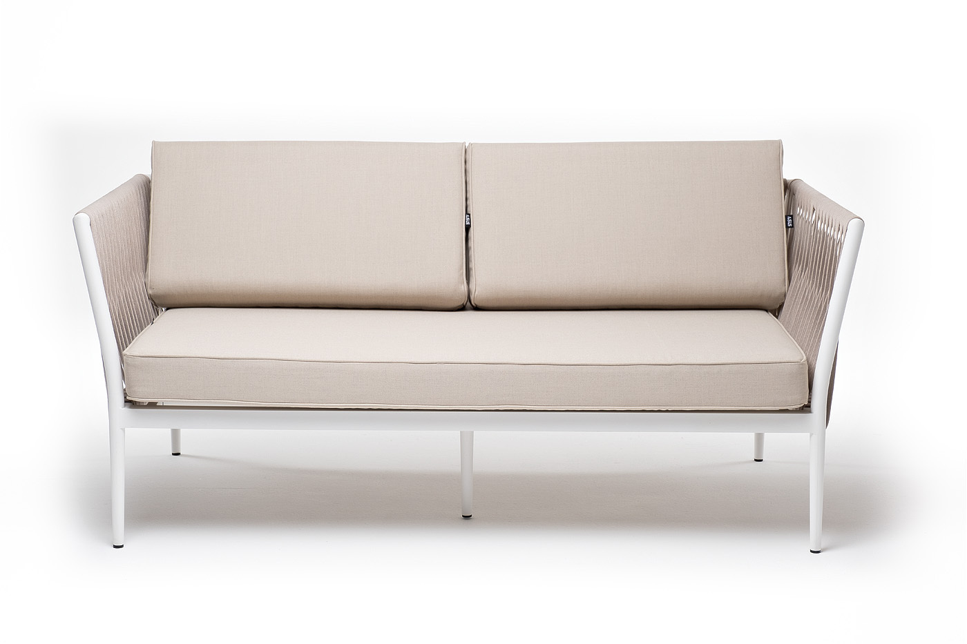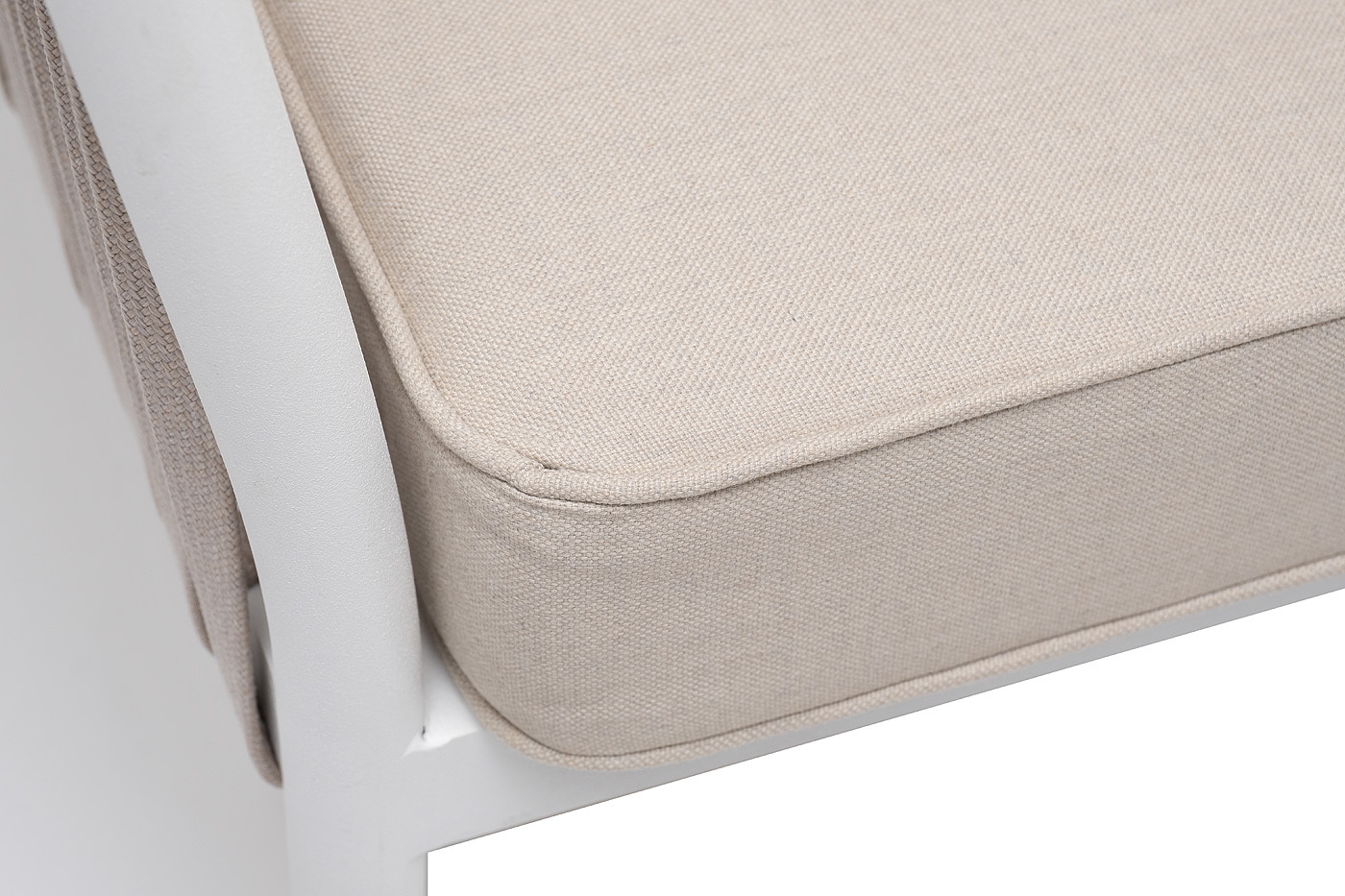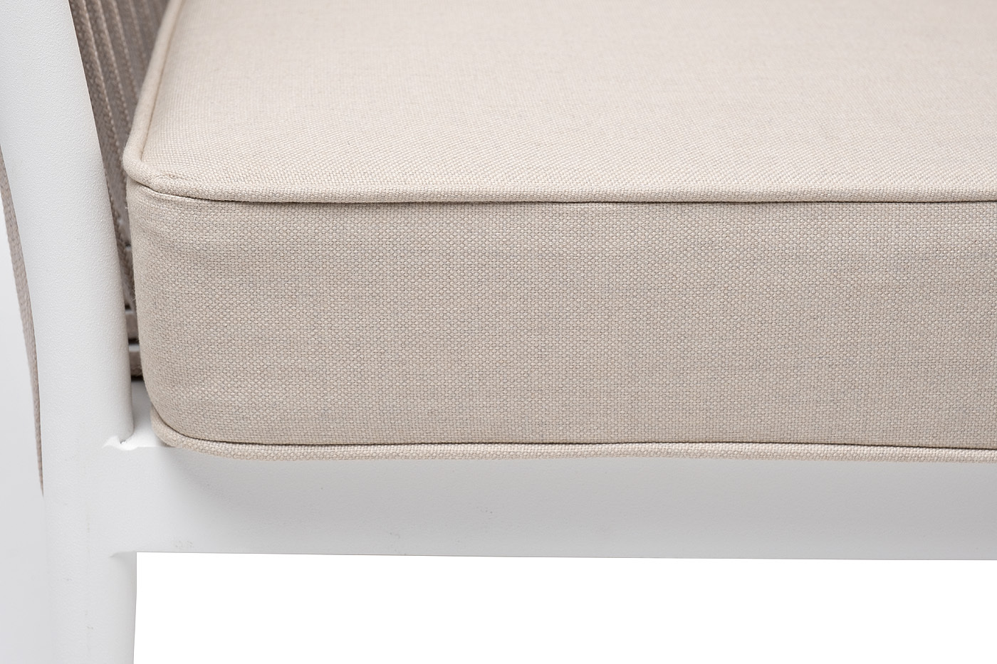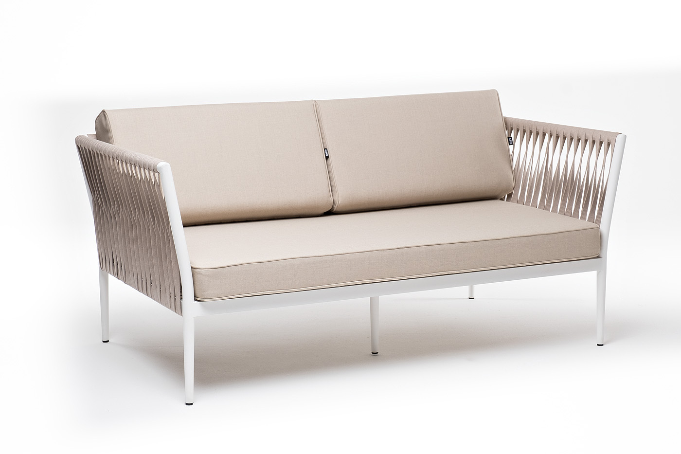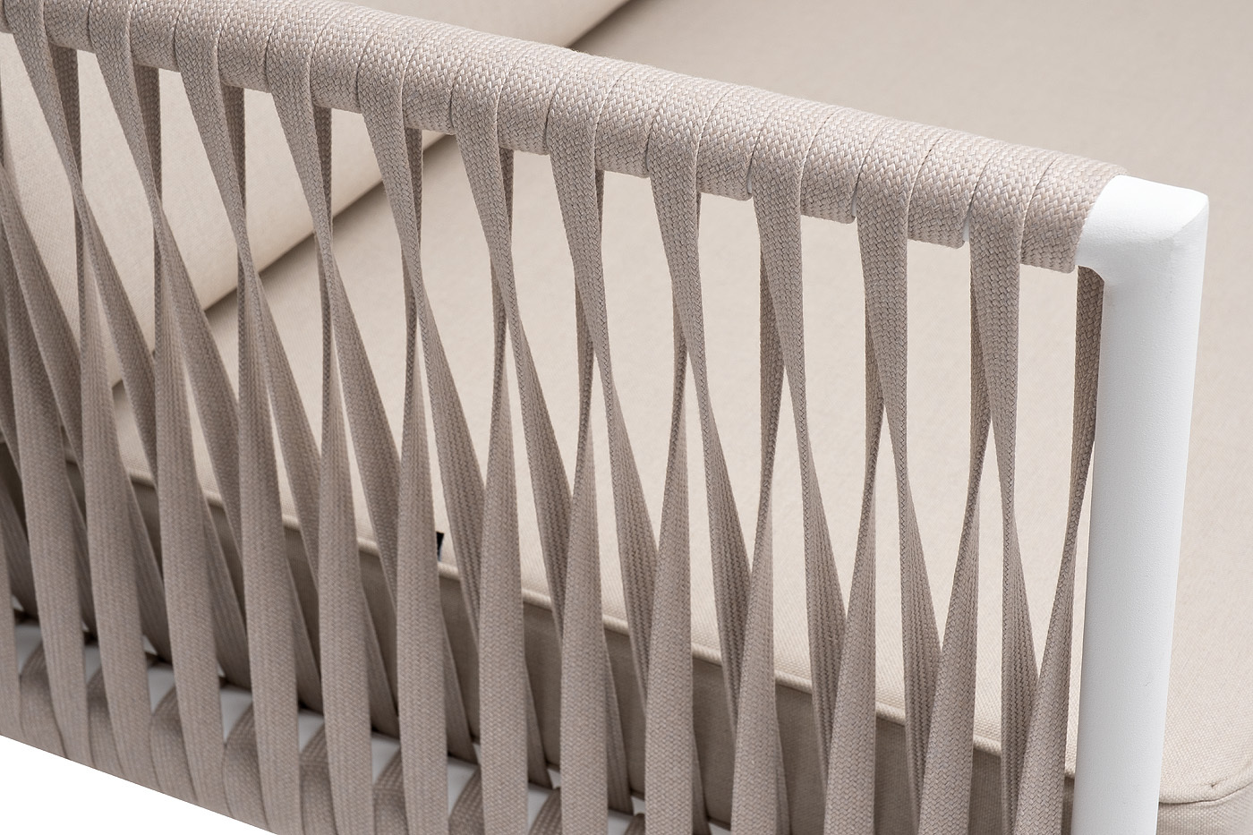 "Касабланка" диван 2-местный плетеный из роупа, каркас алюминий белый муар, роуп бежевый 20мм, ткань бежевая 15052