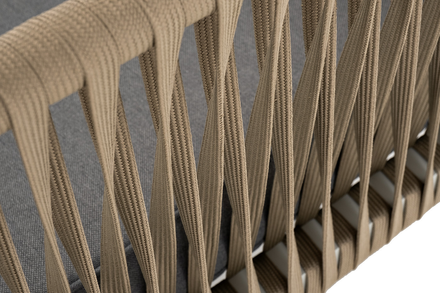 Двухместный диван «Касабланка» с подушками в комплекте. Диван имеет алюминиевый каркас, окрашенный порошковой краской в светло-серый (RAL7035) цвет. Боковины каркаса вручную оплетены роупом - эластичными синтетическими лентами, изготовленными из высокопрочных полиэфирных волокон. Цвет оплетки - серо-коричневый. Подушки со съёмными чехлами, которые обработаны влагоотталкивающей пропиткой. Материал - 100% полиэстер, плотностью 300гр/м2. Размер плетеного дивана: 1600×800×695 мм.Бренд | 4SIS |