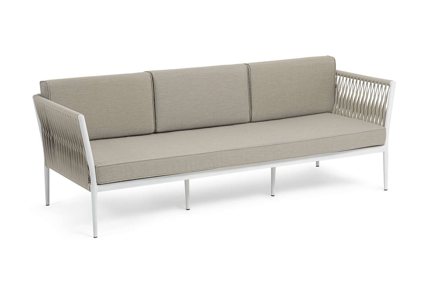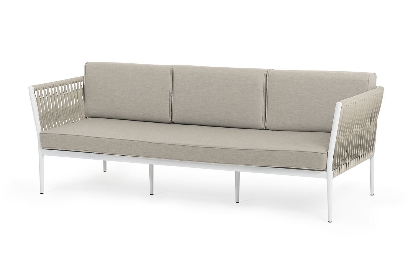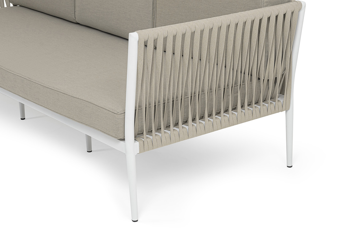 "Касабланка" диван 3-местный плетеный из роупа, каркас алюминий белый муар, роуп бежевый 20мм, ткань бежевая 052