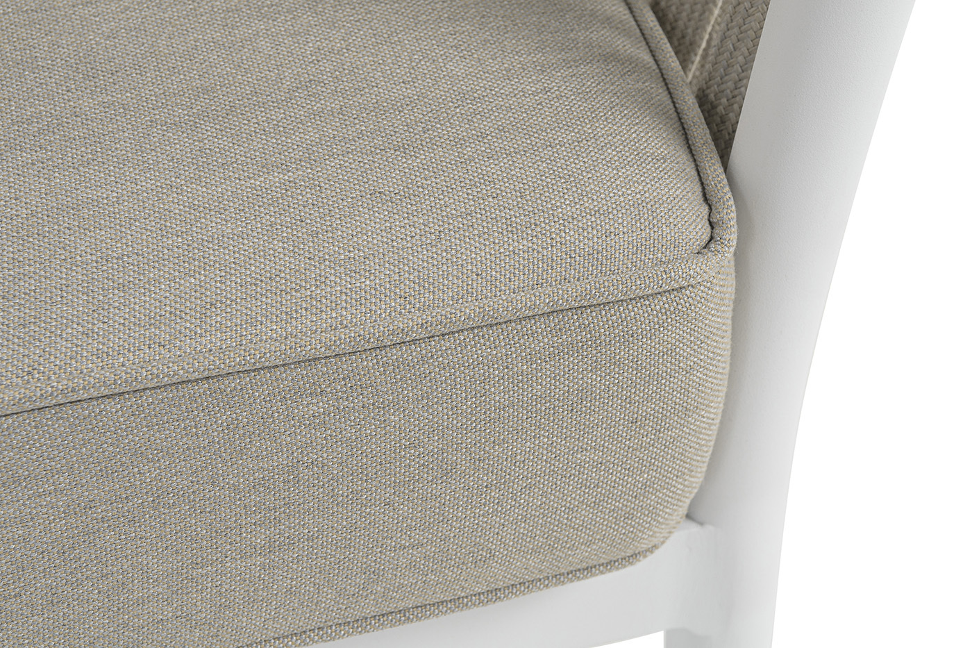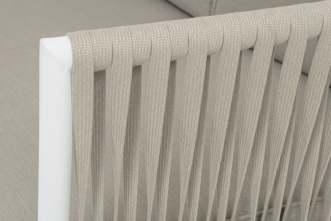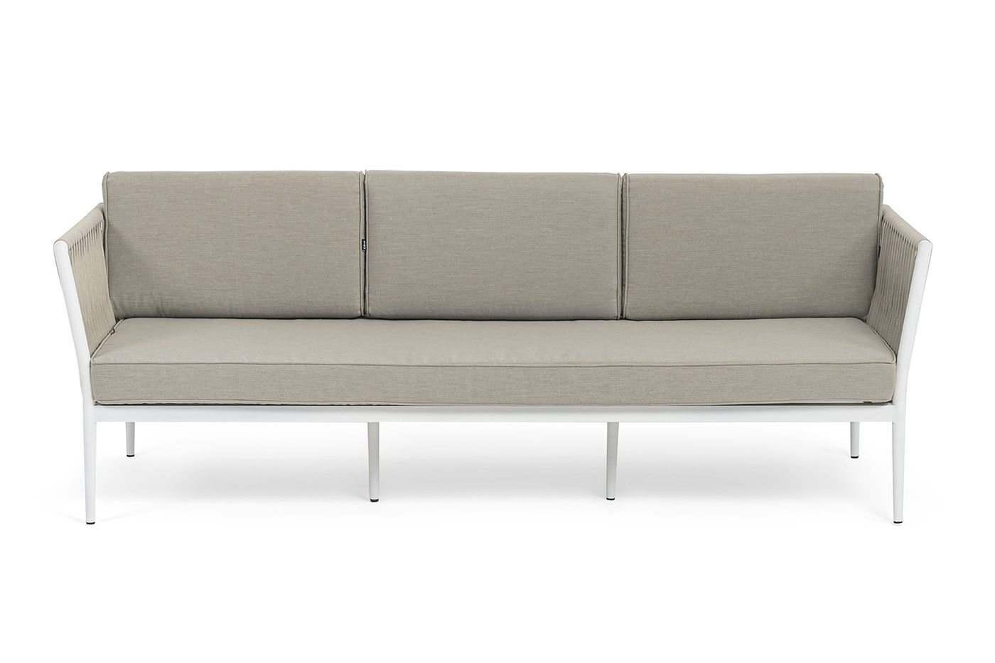 "Касабланка" диван 3-местный плетеный из роупа, каркас алюминий белый муар, роуп бежевый 20мм, ткань бежевая 052