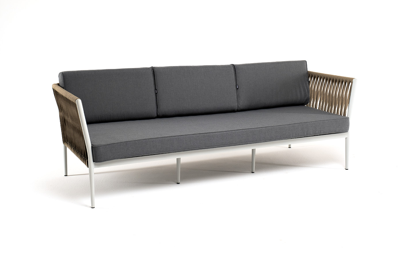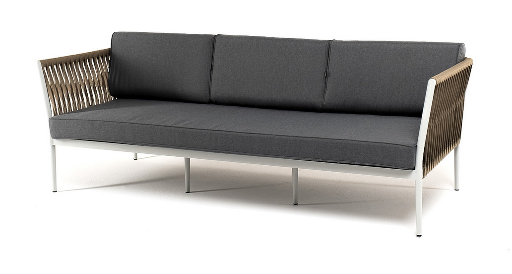 "Касабланка" диван 3-местный плетеный из роупа, каркас алюминий светло-серый (RAL7035) муар, роуп серо-коричневый 23мм, ткань серая 017