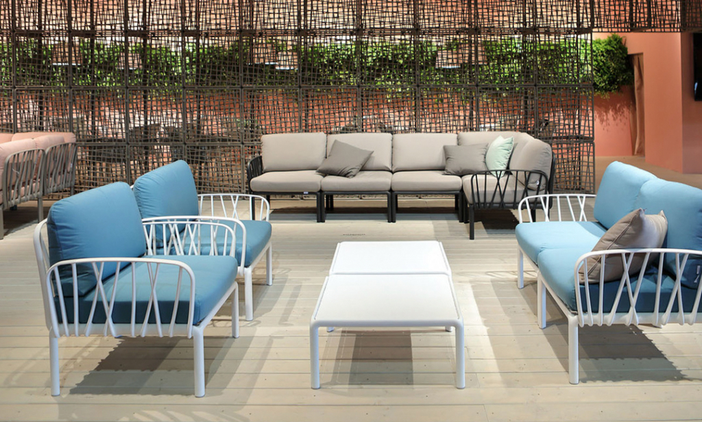 Вы можете купить Диван пластиковый с подушками Nardi Komodo 2, белый, синий оптом в нашем магазине, предложим цену с оптовой скидкой.