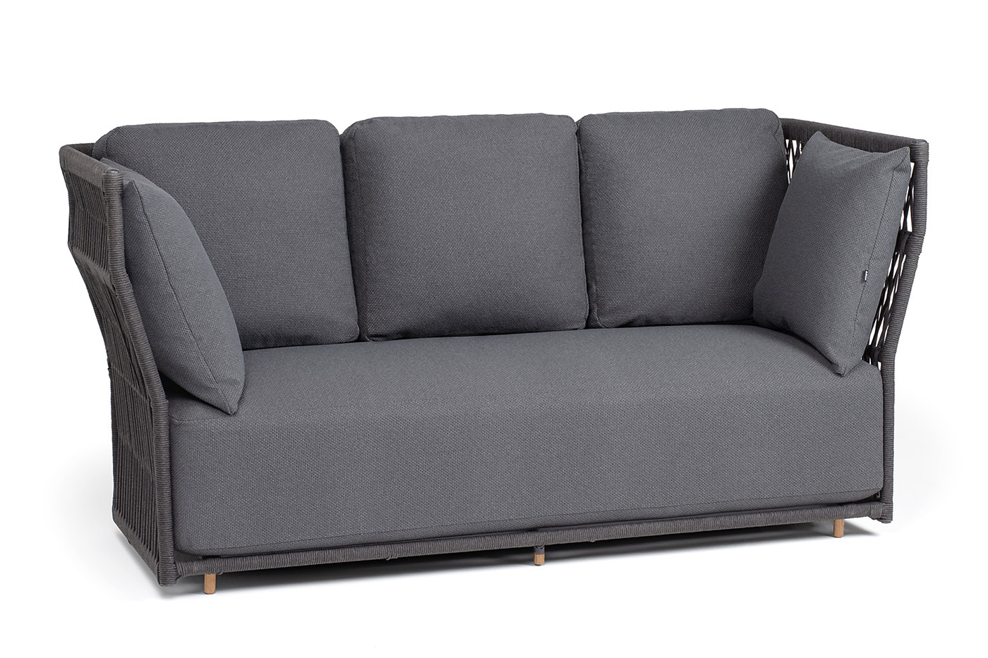 Трехместный диван «Лугано» с подушками в комплекте. Диван имеет алюминиевый каркас, окрашенный порошковой краской в темно-серый (RAL7024) цвет. Боковины каркаса и спинка вручную оплетены роупом - эластичными синтетическими лентами, изготовленными из высокопрочных полиэфирных волокон. Цвет оплетки в тон каркасу - темно-серый. На ножках дивана идут дубовые наконечники (заглушки). Подушки состоят из наполнителя и съёмных чехлов, которые обработаны влагоотталивающей пропиткой. Материал - 100% полиэстер, плотностью 300гр/м2. Размер плетеного дивана: 2020×820×990 мм.Бренд | 4SIS |