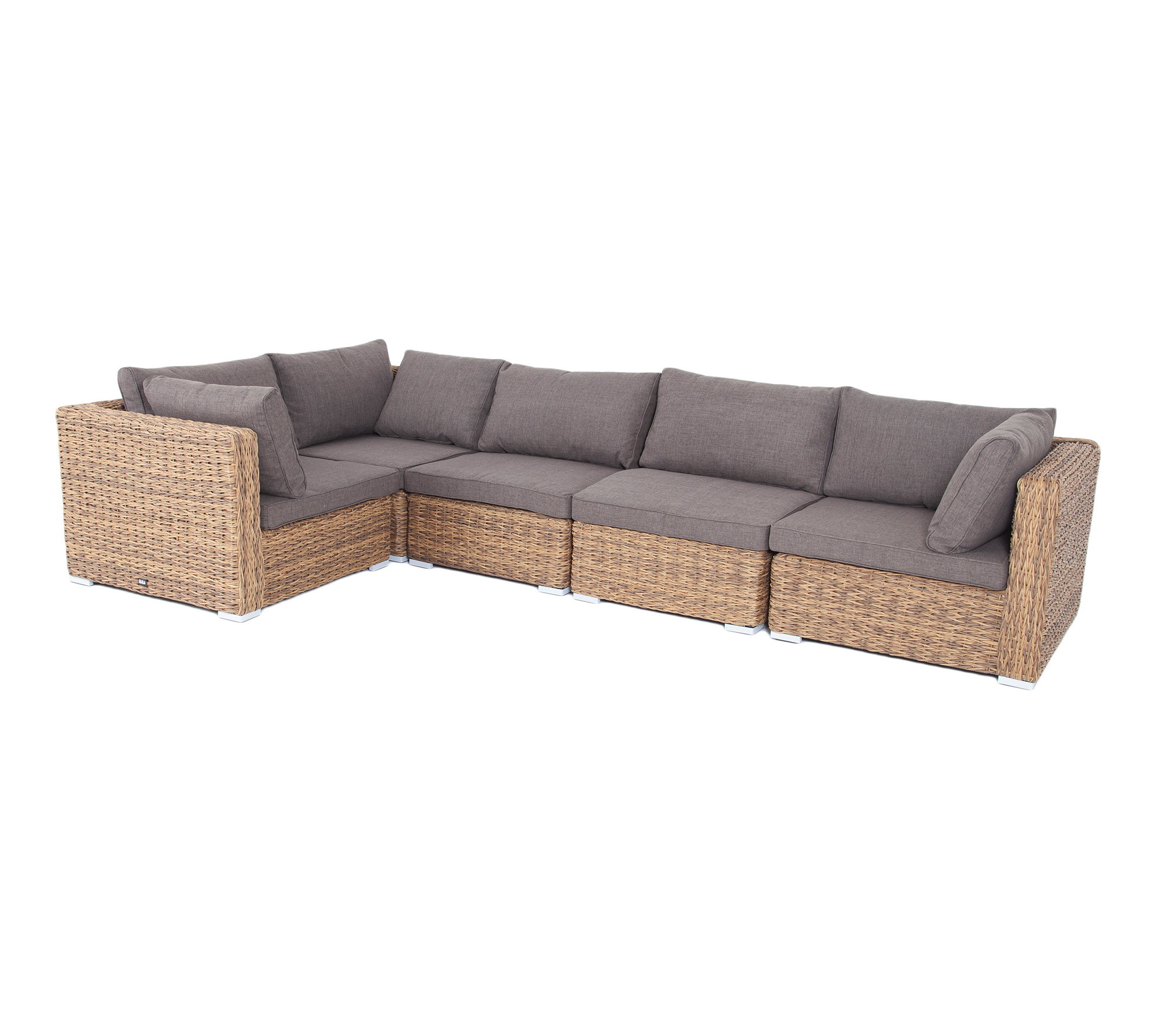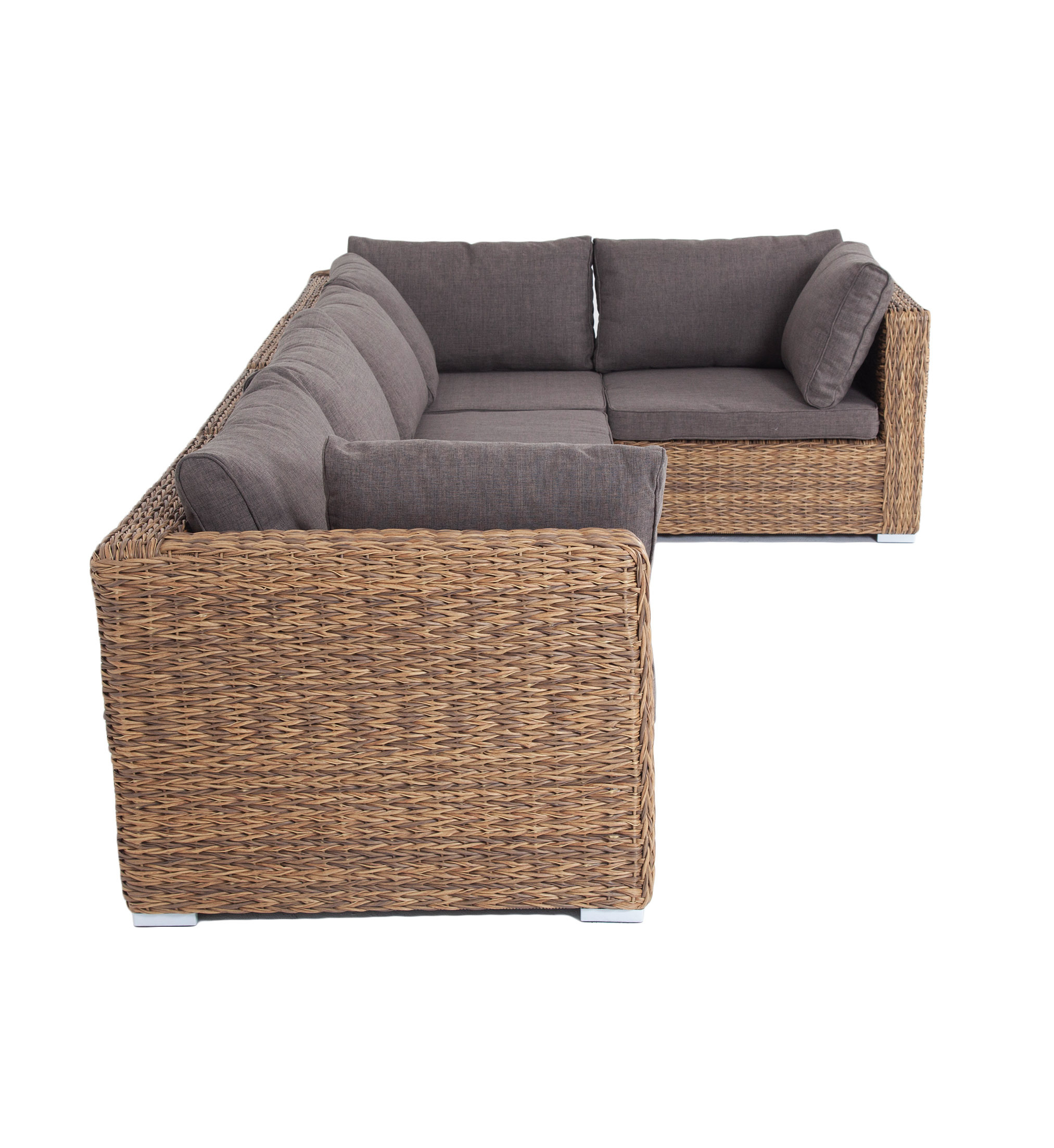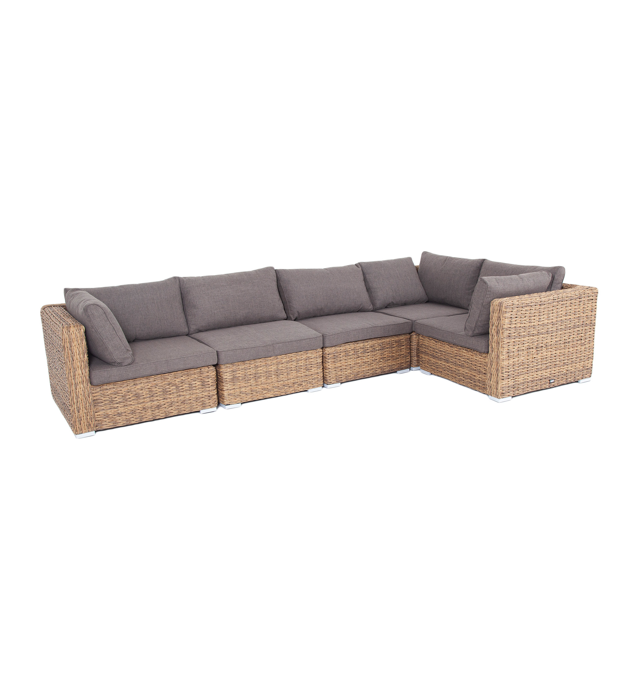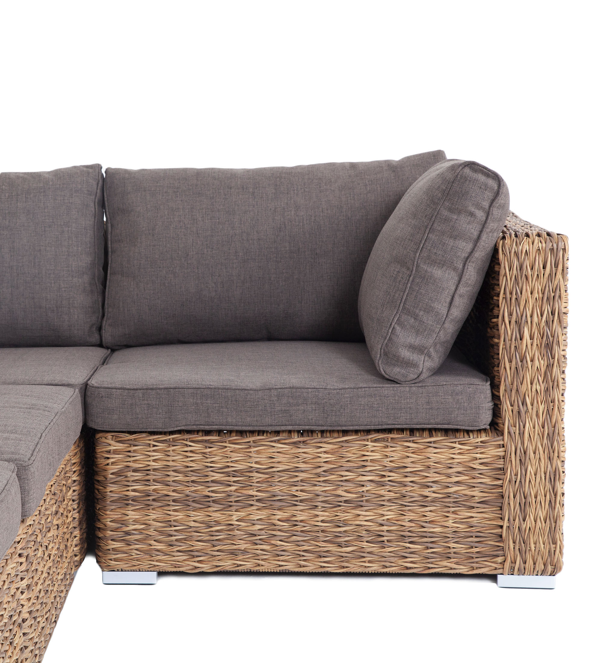 Трансформирующийся диван «Лунго» подходит для одновременного размещения до 8 персон. Его каркас выполнен из прочного алюминия. Мебедь состоит из трех угловых модулей размером – 860×860×650 мм и двух прямых модулей размером – 740×860×650 мм. Комплект выполнен из искусственного ротанга вида «гиацинт» ручного плетения. Представлен в соломенном цвете. Модульный диван дополняют подушки со съёмными чехлами в сером оттенке. При их пошиве используется полиэстер, плотностью 300гр/м2. Ткань обрабатывается влагоотталкивающей пропиткой для усиления ее защитных качеств. "Лунго" модуль диванный угловой с подушками, цвет соломенный (гиацинт) 3шт. 860Х860Х650, "Лунго" модуль диванный прямой с подушками, цвет соломенный (гиацинт) 2шт. 740Х860Х650,Бренд | 4SIS |