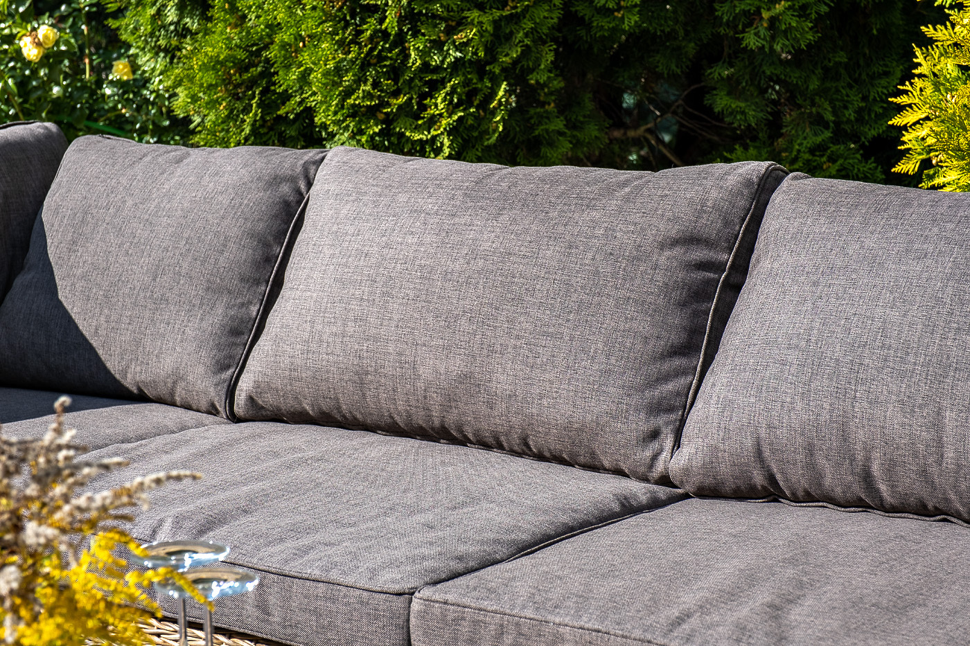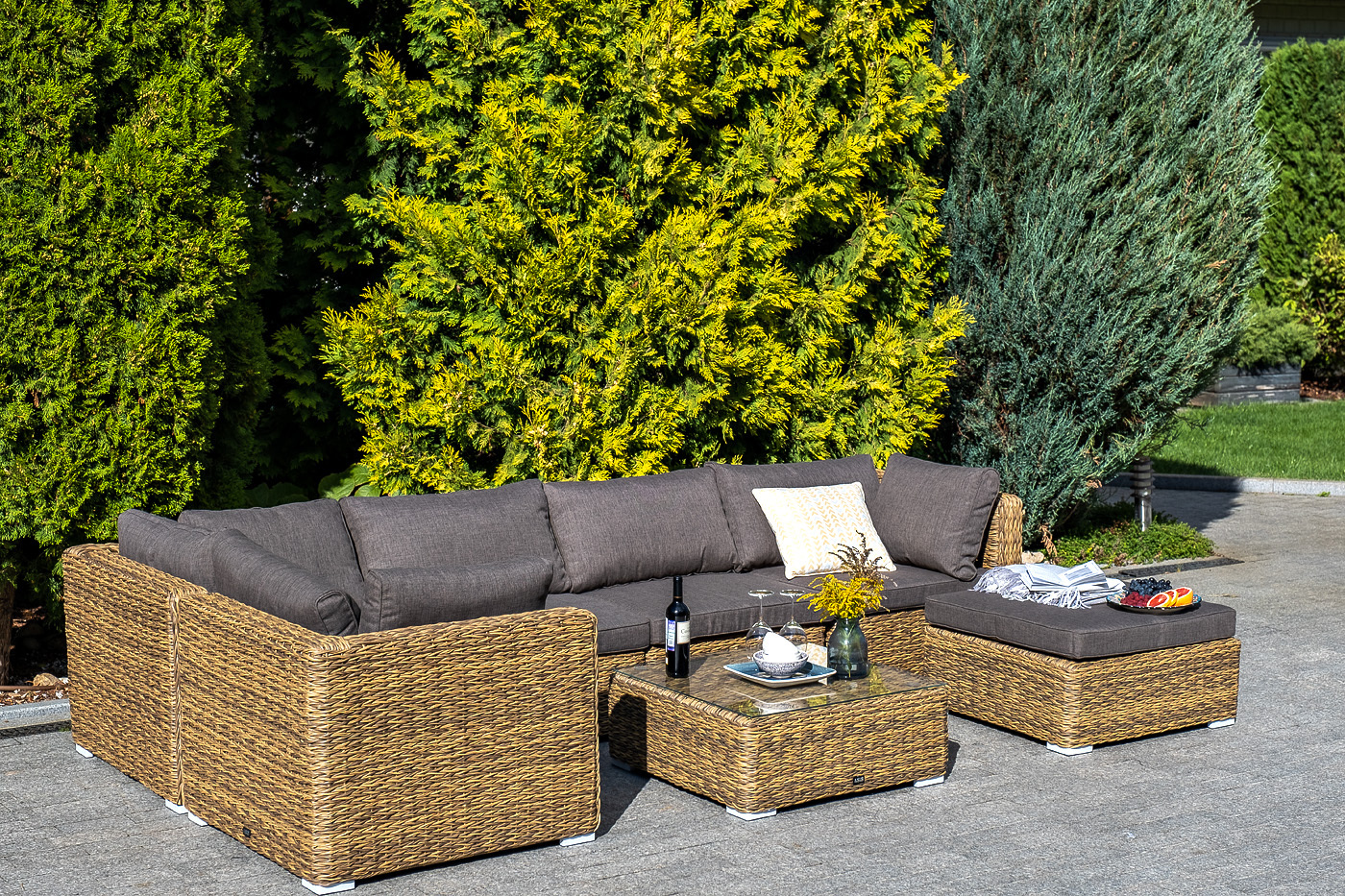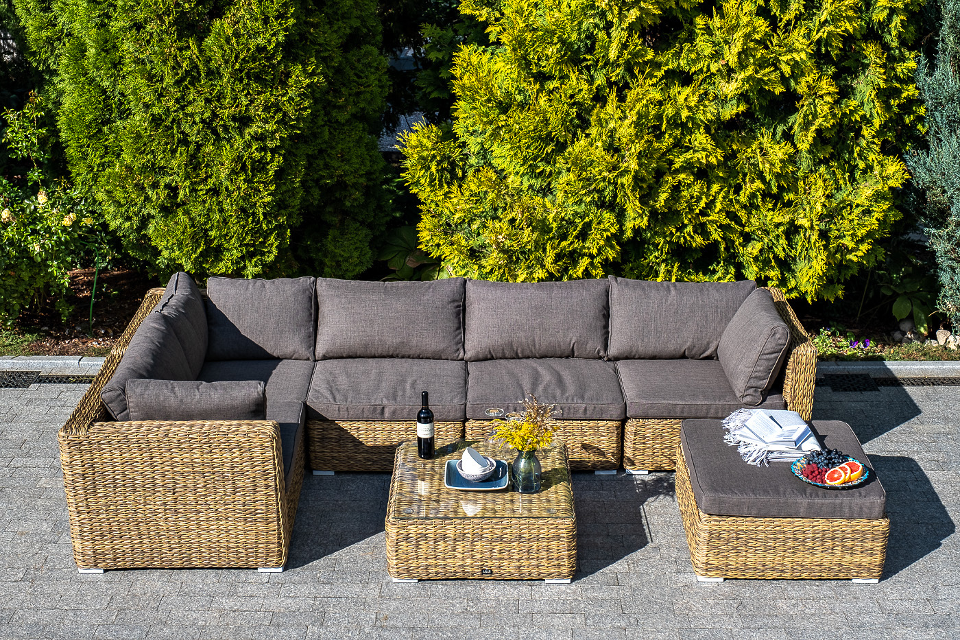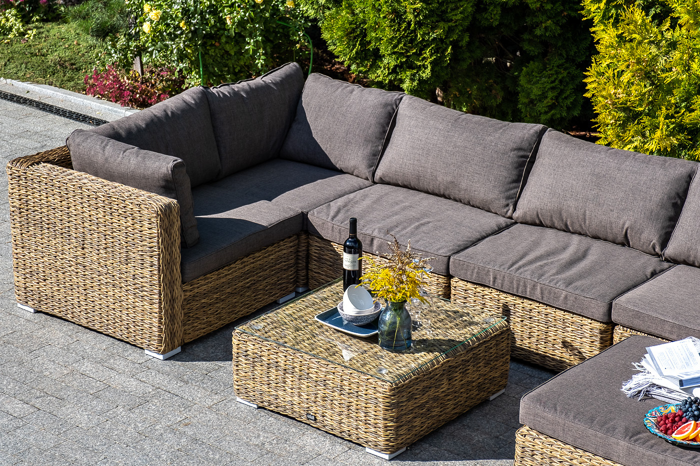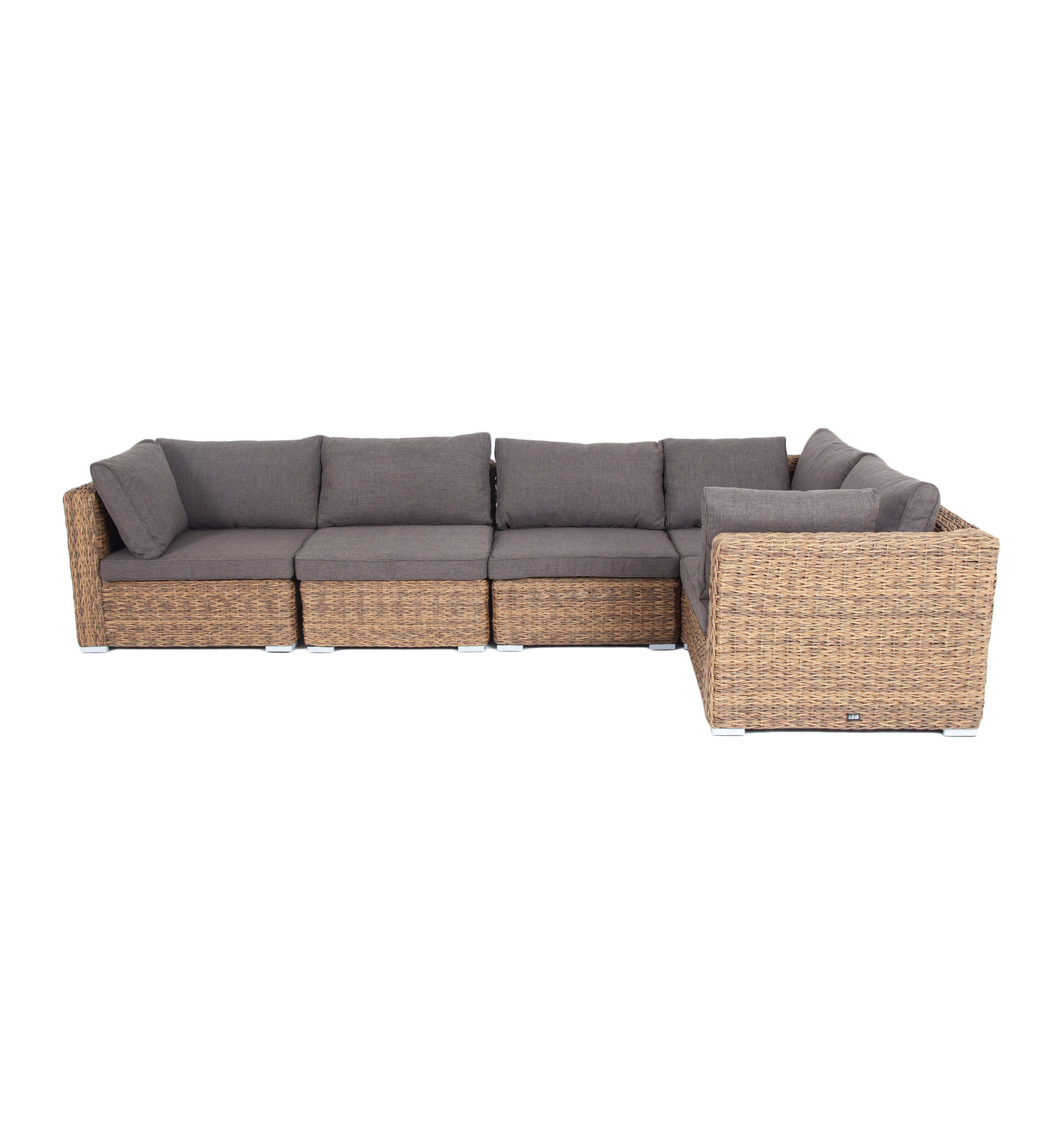 Трансформирующийся диван «Лунго» подходит для одновременного размещения до 8 персон. Его каркас выполнен из прочного алюминия. Мебедь состоит из трех угловых модулей размером – 860×860×650 мм и двух прямых модулей размером – 740×860×650 мм. Комплект выполнен из искусственного ротанга вида «гиацинт» ручного плетения. Представлен в соломенном цвете. Модульный диван дополняют подушки со съёмными чехлами в сером оттенке. При их пошиве используется полиэстер, плотностью 300гр/м2. Ткань обрабатывается влагоотталкивающей пропиткой для усиления ее защитных качеств. "Лунго" модуль диванный угловой с подушками, цвет соломенный (гиацинт) 3шт. 860Х860Х650, "Лунго" модуль диванный прямой с подушками, цвет соломенный (гиацинт) 2шт. 740Х860Х650,Бренд | 4SIS |