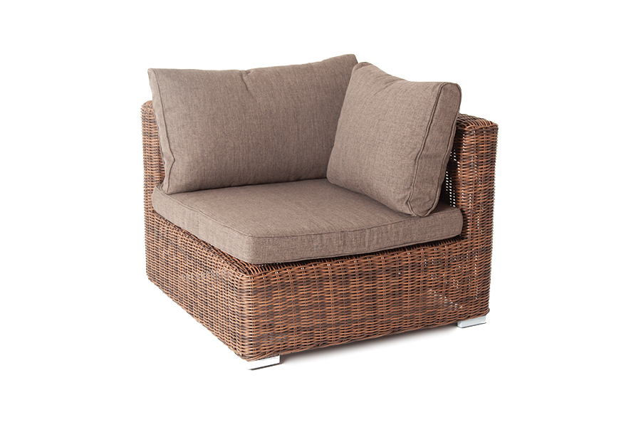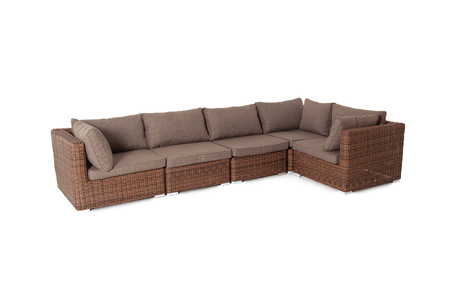 Диван из ротанга «Лунго» относится к группе трансформирующихся моделей, которые рассчитаны на большую компанию. Он состоит из набора модулей: трех угловых (размер – 860×860×650 мм) и двух прямых (740×860×650 мм). В качестве основы мебели используется алюминиевом каркас высокой прочности. Ее дополняет ручная оплетка, сделанная из круглого искусственного ротанга в коричневом оттенке. На модульном плетеном диване находятся удобные подушки с чехлами, которые можно снять. Они пошиты из качественного полиэстера серого цвета с плотностью 300гр/м2. Ткань предварительно обрабатывается влагоотталкивающей пропиткой. "Лунго" модуль диванный прямой с подушками, цвет коричневый 2шт. 740Х860Х650, "Лунго" модуль диванный угловой с подушками, цвет коричневый 3шт. 860Х860Х650,Бренд | 4SIS |