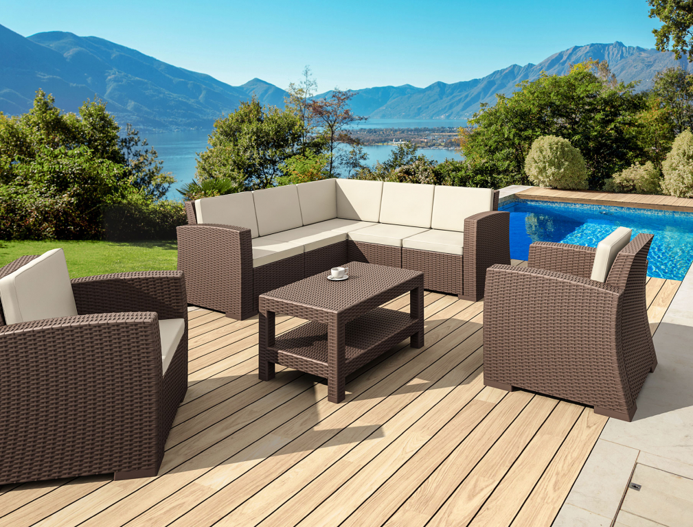 Вы можете купить Диван пластиковый плетеный угловой с подушками Siesta Contract Monaco Lounge Corner, коричневый оптом в нашем магазине, предложим цену с оптовой скидкой.