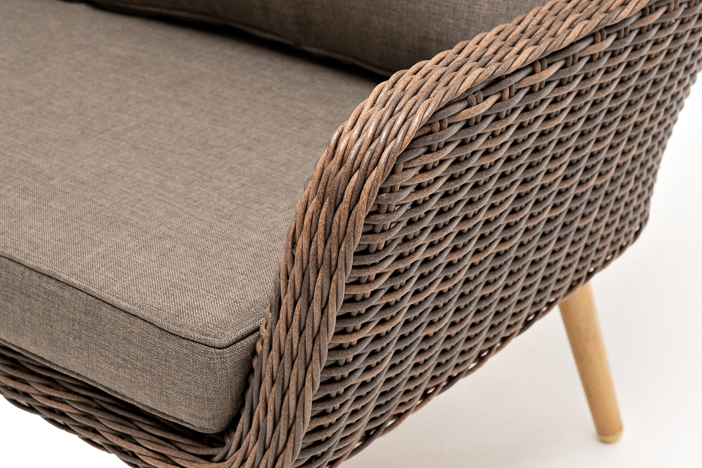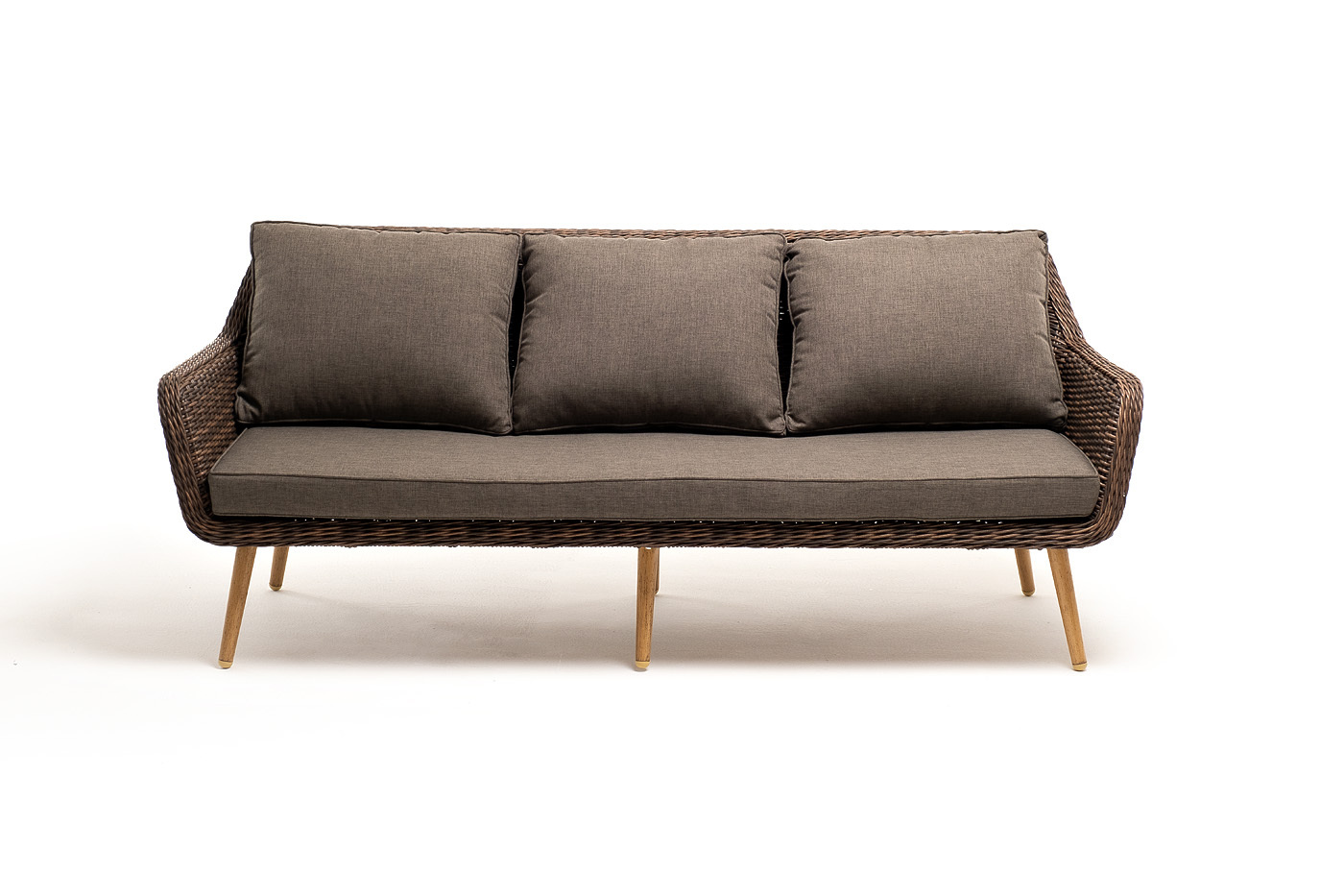 Диван «Прованс» идеально подходит для размещения трех человек. Он имеет алюминиевый каркас, который выдерживает повышенные нагрузки. Для оплетки каркаса используется высококачественный искусственный ротанг. Мебель выполнена в коричневом цвете. Трехместный диван дополняют мягкие подушки в сером цвете со съёмными чехлами. Тканевые изделия выполнены из прочного полиэстера плотностью 300гр/м2. Материал имеет влагоотталкивающую пропитку. Размер модели – 1900×800×770 мм. *Требуется сборка!Бренд | 4SIS |