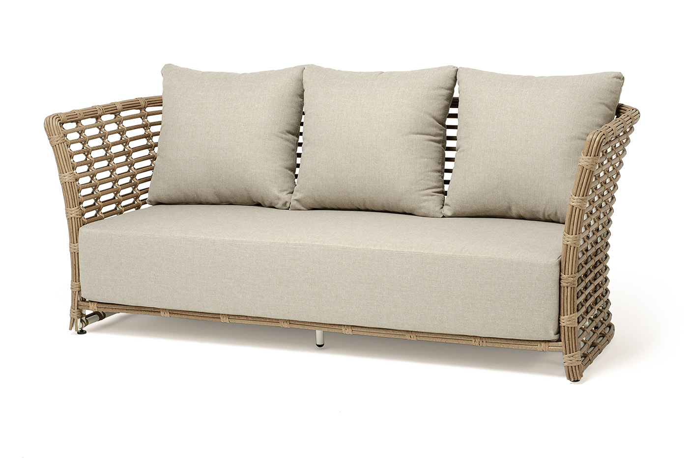 Диван «Валенсия» подходит для размещения сразу трех персон. Его основа из прочного алюминиевого каркаса. Ручное круглое плетение является основным декоративным элементом мебели. Оно выполнено из искусственного ротанга в соломенном цвете. В комплекте с трехместным диваном идут мягкие подушки для комфортного расположения. Чехлы съёмные бежевого цвета из высококлассного полиэстера с плотностью 300гр/м2. Защитные свойства ткани усиливаются при помощи влагоотталкивающей пропитки. Размер модели – 2020×850×800 мм.Бренд | 4SIS |