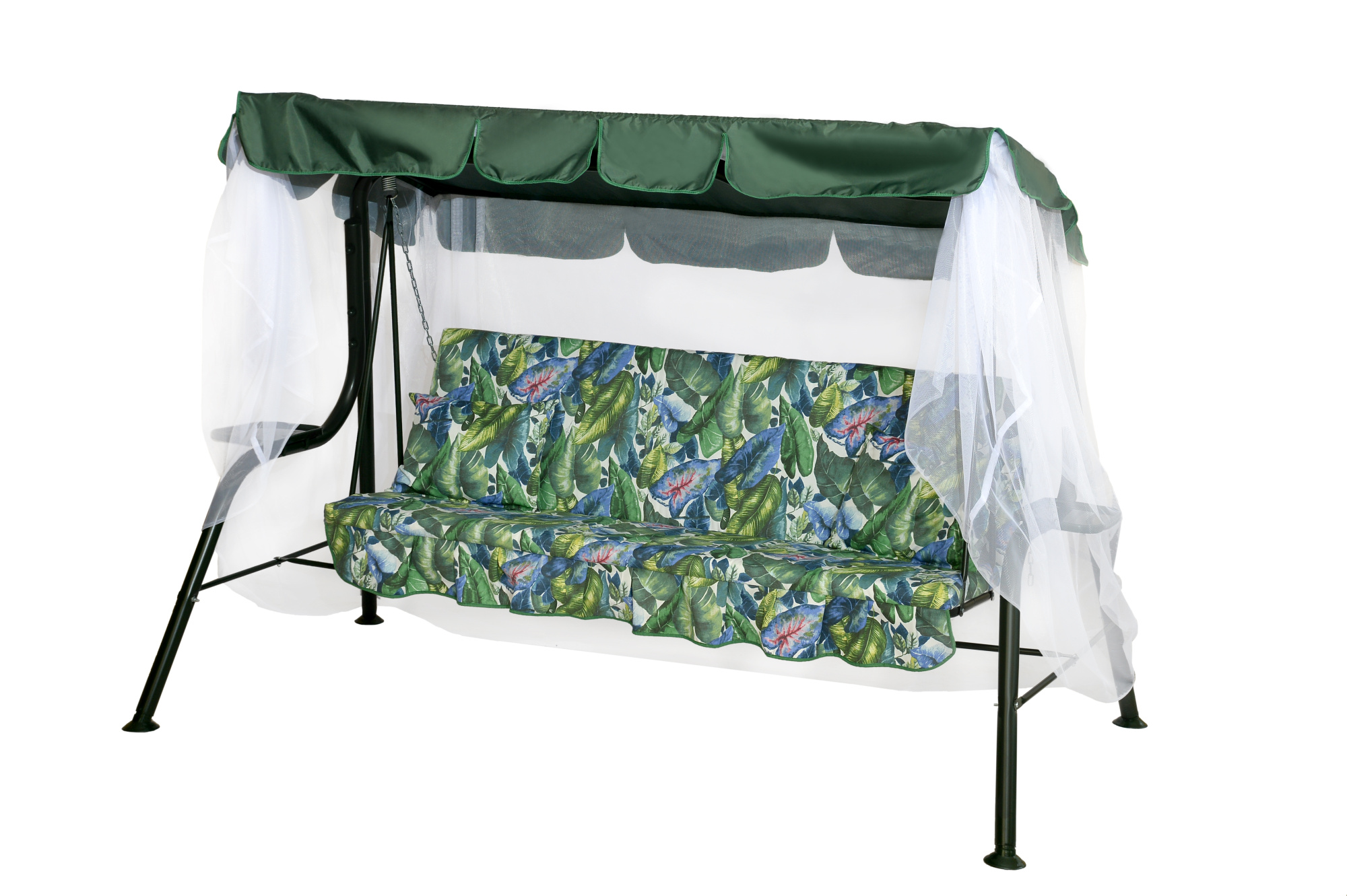 Качели садовые OLSA 3-х местные Варна меб.ткань(каркас зеленый, м/э зеленый рис.листья)1 уп.
